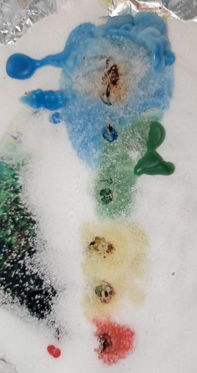 И в этот раз я решила на всю поверхность меж свечей соль добавить, в сл. чего где была свеча чакры Аджны  в месте от свечи прожиг подгоревший сильный образовалось (приложу фото),  с утра нарисовала себе букву Свим на области *третьего глаза*, может буква мешала  или так высветился определенный негатив, а возможно это просто соль..но в нашем деле не всегда все просто...