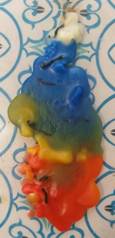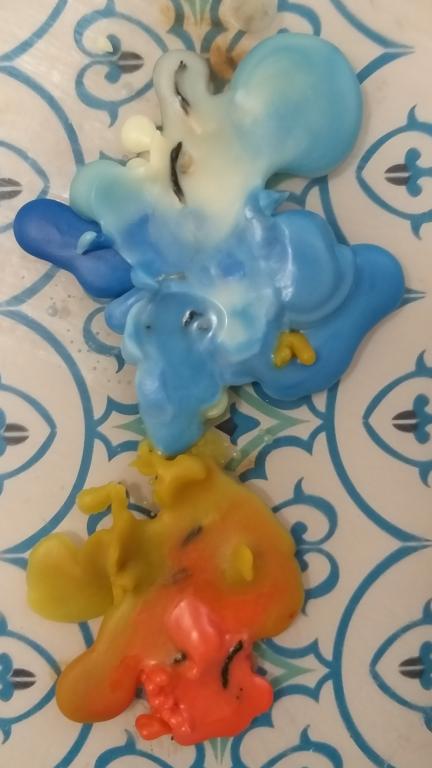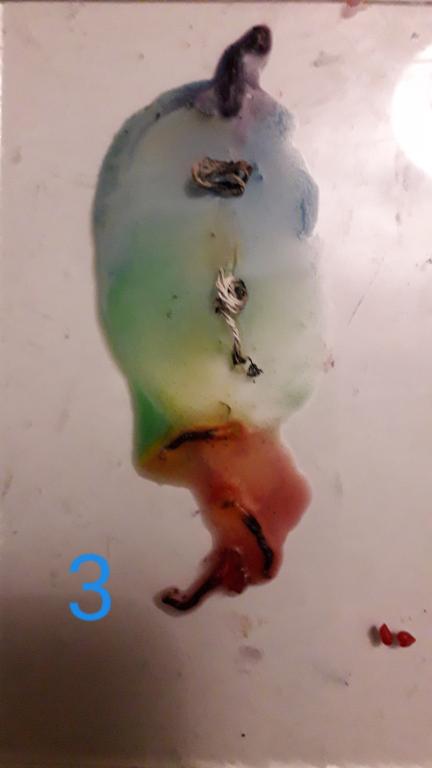 Мои оплывы после прожигов (фото 1 - самый первый раз, 4 - последний, 2 и 3 - промедуточные, остальные не фотографировала, т.к. ярких изменений не было). На 2-м интересно горели 3 нижние свечи: уже догорая свились фитили вместе и в луже воска продолжали гореть так, что получился в серединке абсолютно круглый островок без воска с горящими фитилями, а по краю, вокруг островка с фитилями, кольцо из красного воска, потом внизу кольцо разорвалось (воск растаял и выгорел).