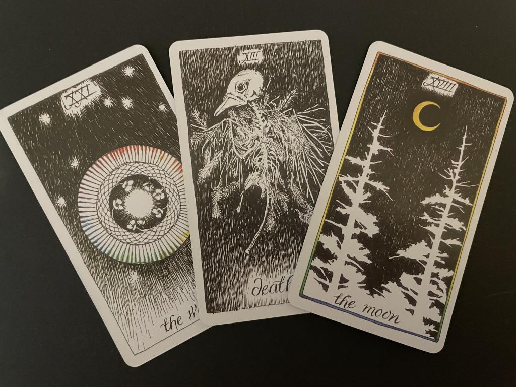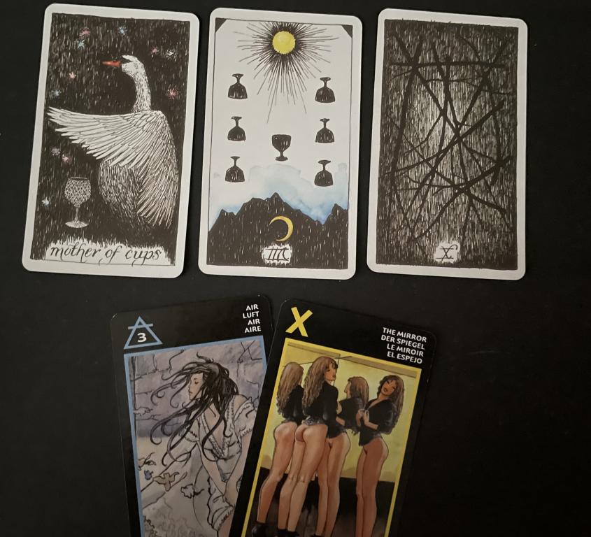 Королева кубков - 3ка кубков (5ка кубков, Император, паж кубков) - Луна (9ка кубков) = Дьявол ( Король кубков)