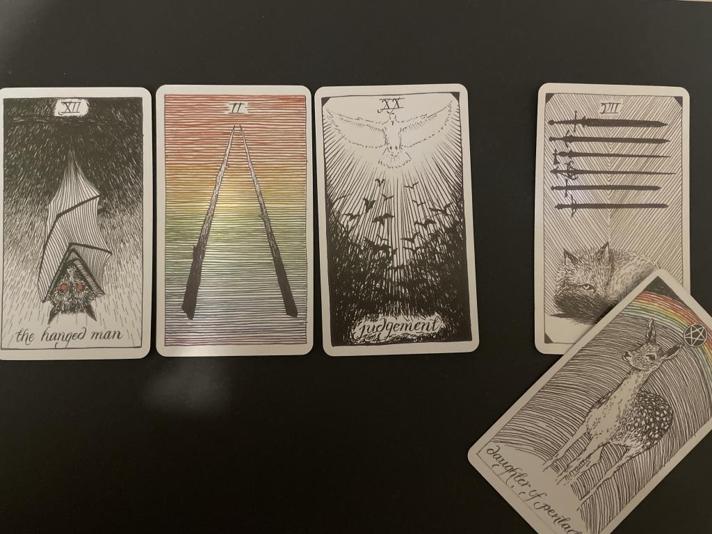1.  9ка мечей - 9жезлов  - Король кубков ( Паж пентаклей, паж кубков, 7ка кубков, 4ка кубков) = Король жезлов