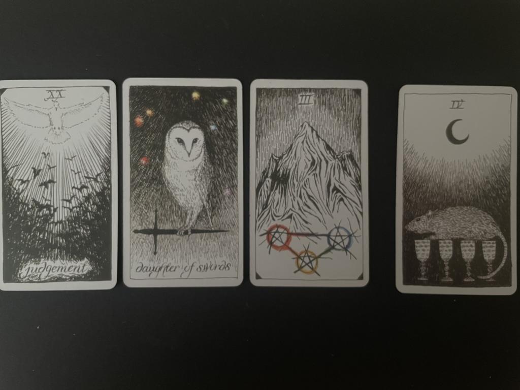 Башня(Суд, 7ка пенатклей, 6ка пентаклей, 10ка кубков) - 3 ка пентаклей - Король пентаклей = 4ка жезлов