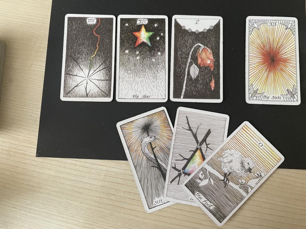 Король жезлов, паж мечей, туз пентаклей, звезда, 3 мечей, 6 жезлов.