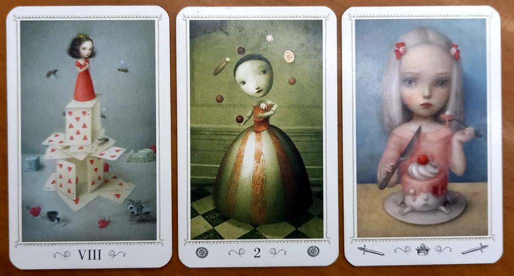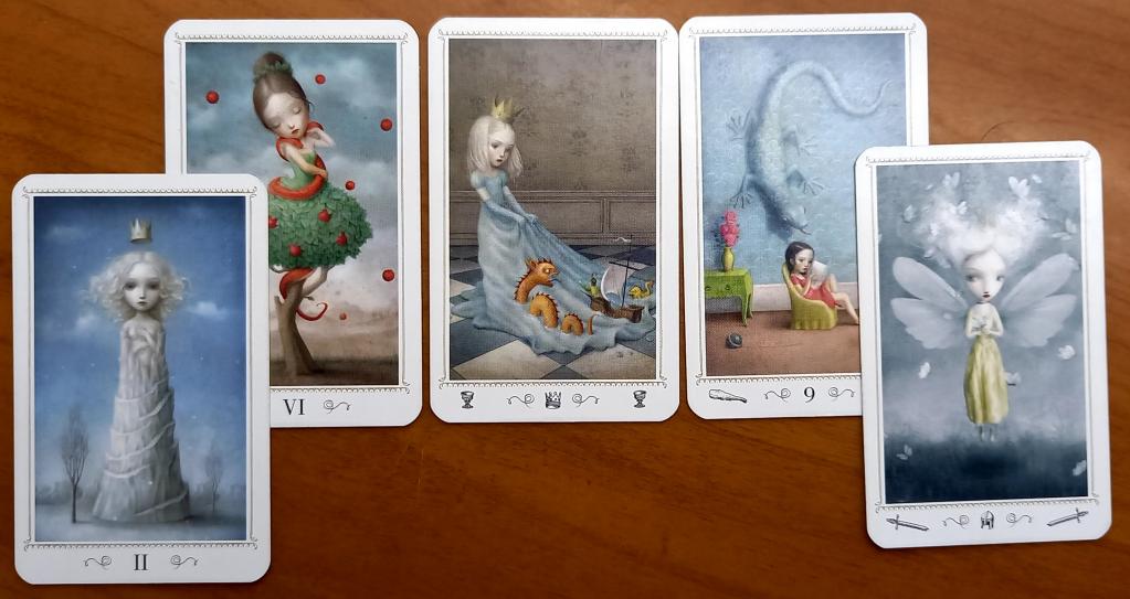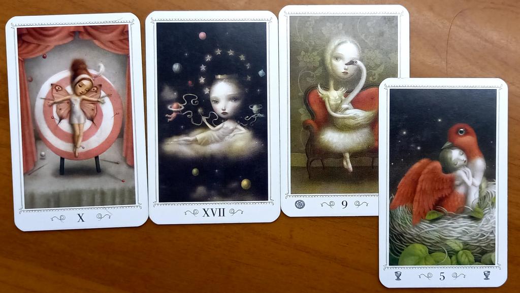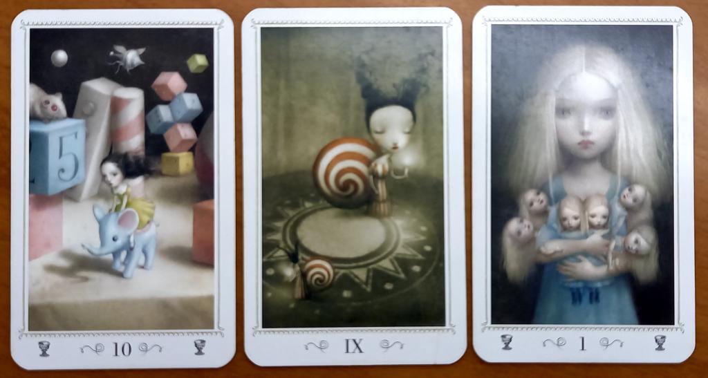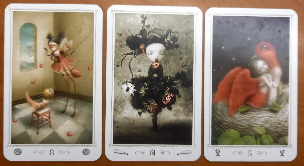 2 пентаклей, 6 мечей, Мир, Императрица, 3 мечей, 9 кубков.
