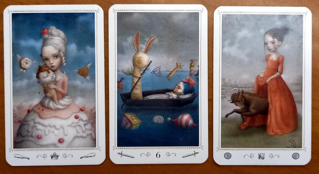 Король кубков, Правосудие, 3 мечей, паж мечей, 3 пентаклей, Маг.