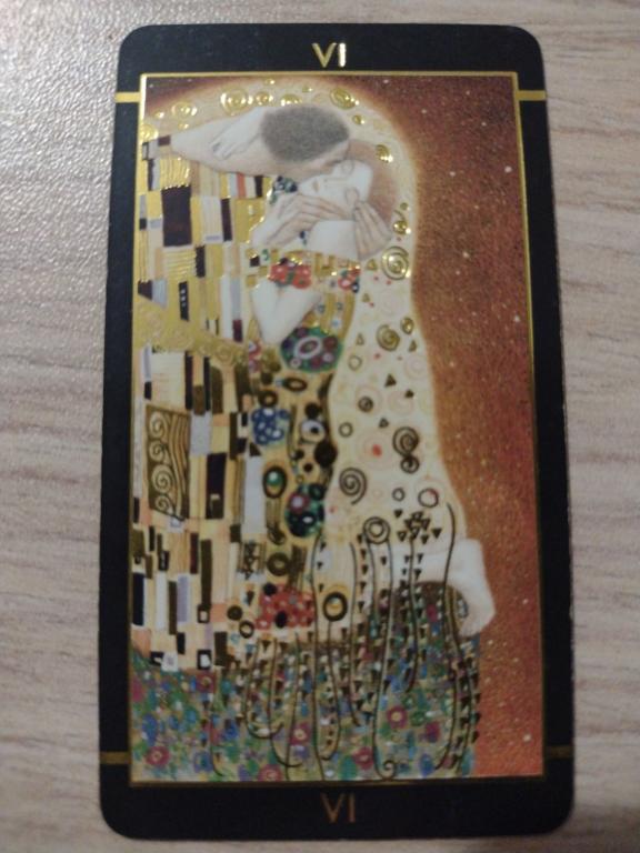 Композиция карты смещена влево. Вместо мешка тут просто второй действующий герой, точнее, героиня ...с закрытыми глазами и золотой накидкой (критики картины утверждают, что так Климт хотел изобразить чувственную негу влюблённых во время процесса). Карта светлая с чёрной рамкой. Действительно, на картине есть золотые элементы, орнаменты и цветы. Про удушье... обратите внимание как руки мужчины держат лицо женщины! Возможно, мужчина действительно от страсти увлёкся и силой подтягивает лицо женщины. А женщина при этом даже как-то сопротивляется.... Эта картина оставляет для смотрящих много вопросов без ответов  :o Возможно, поцелуй не такой уж и взаимный, а?  ;) ..ведь позади женщины обрыв!