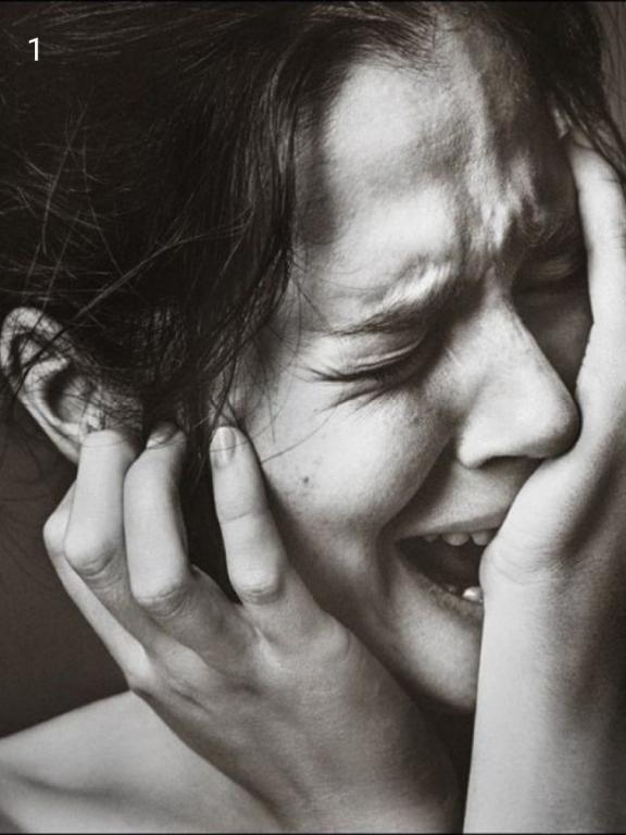 Интуитивно картинкой на 2 фото женщина. Волосы на уровне плеча. Эмоции гнев/страдание/невозможность с сем-то смириться,  с открытым ртом, гримаса. Как изнутри рык глухой идет. (Царь Леонидас кричал Спарта с таким лицом, такое идет). Мне идет, что это не радостная эмоция.