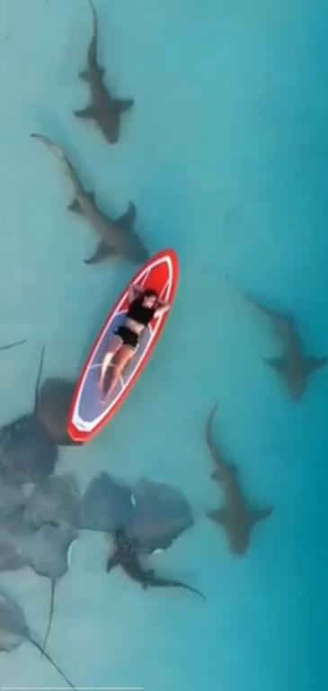 На видео девушка на сапе качается на волнах, а под ней плавают акулы и скаты.