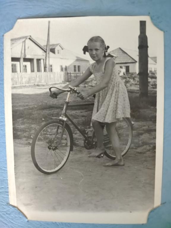 На этом старом фото-моя мама в подростковом возрасте,с велосипедом. Время года-лето, босиком,всю жизнь натуральная  блондинка с вьющимися тонкими волосами, на фото кажется, что темнее.