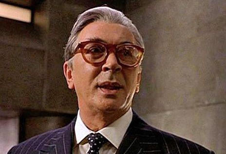 Светлые волосы (или седые) зачёсаны назад, очки, светлая рубашка.