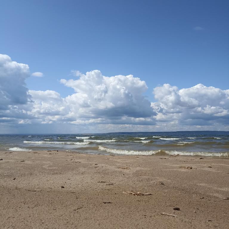 Лето, водоём, берег видно, далековато правда) - это отлично! Прекрасно описали погоду!)