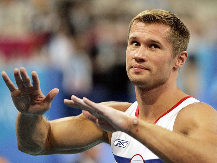На фото олимпийский чемпион России Алексей Немов. Фото сделано на олимпиаде в Афинах 2004г, спортсмену на тот момент 28 лет.