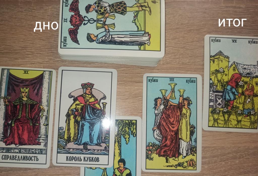 Почему-то к средней карте вытащила две (4 кубков). Я так понимаю, нет.. одни кубки и Справедливость. Интересно как .. дам ОС по сроку. Король кубков - это начальниуюк, думаю.. и интересно, если смотреть как на оракул - Король держит чашу, а потом эта же чаша на 4 кубков (с рукой) - может как возможность будет или предложение?... А я прям как на 4 чаш - вообще не хочу)
