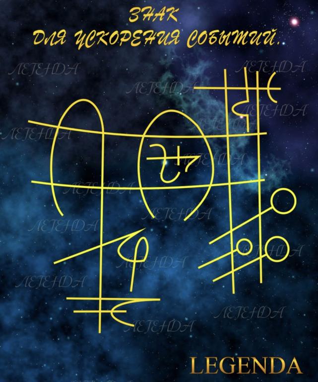Этот знак поможет вам ускорить любое, нужное для вас, событие. Наносите его на лист бумаги, опускаете его в ёмкость с вином или жертвенной кровью, оставляете на ночь, а утром сушите лист с знаком и сжигаете на огне белой свечи. Пепел смешиваете с вином или жертвенной кровью в откуп и относите под женское дерево. Перед началом работы зажигаете белую благодарственную свечу. Оплывы от свечей отдаете воде. Работаете с оговором