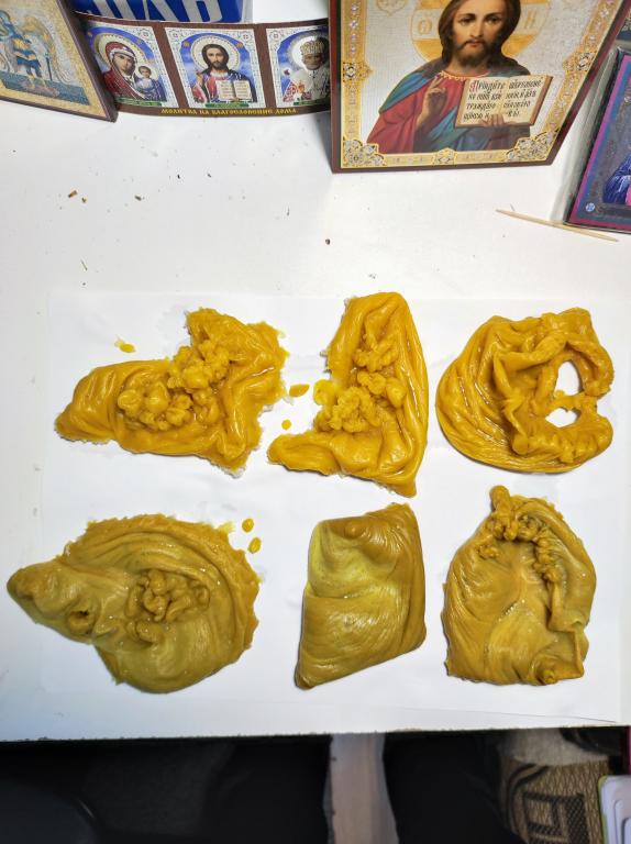 На отливках имеется подселенец, плюсом еще многочисленные воздействия. Хорошо что пле в большинстве своем чистое. но это скорее всего просто из-за не того заговора. Каналов как таковых не видно, но есть сущь. Вот и пробуйте от некропривязоок заговор или от сущей. подселенцев. Должно помочь поглубже копнуть. Воск Вам откликается и работа идет своим чередом.