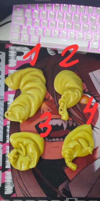 Доброго времени суток. Помогите, пожалуйста, интерпретировать отливки. Отливала саму себя 4 раза. Отливки подписаны 1-2-3-4 в порядке очередности отливов. На мой взгляд отливка 1м показала приворот и лярву и нестабильную энергетику. На второй снова приворот и мои страхи. На третьей остался только приворот. Но по поводу 4 отливки вообще не знаю что это за гряда такая (похожа на хребет дракона), вижу только маленькую лярву сборку. Заранее спасибо