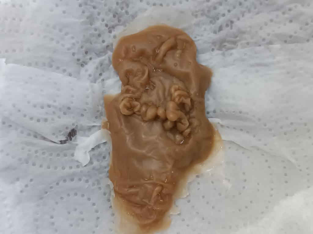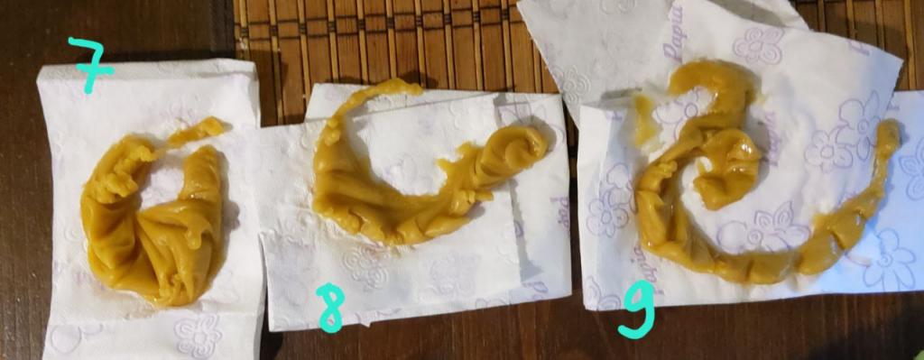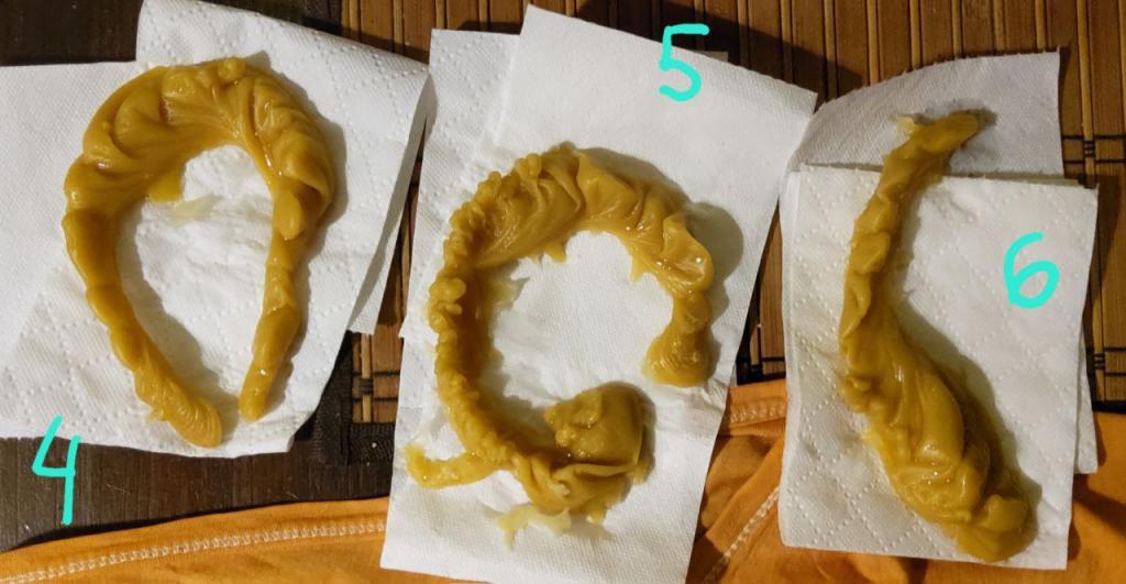 В первом сообщении были отливки первой половины дня вчера, а вторую серию ближе к ночи сделала, около 23 (4,5,6). Ну, во всей красе лежит на 4 да, проветривается? на пятой видимо колбаснула отливка, сморщился гад и на 6 прятаться стал. В первой половине дня сегодня 7,8,9. Тоже кажется сначала на 7 на полном комфорте в домике и с кем-то на проводе. сделала второе фото 7 отливки чтобы было повиднее как оно хорошо время проводит >:( на 8 опять напряг виден а на 9 растянуло его и какая-то вторая голова или хвост показались. что-то похожее и на 5 отливке было. Непонятно идет ли процесс позитивно, прошу ваших мнений. Все же мне кажется "словами лихими" я эти гири долго буду пилить. Добавила святой воды колпачок и обращение аккуратное хэ. Но не присмотрела пока других начиток. Вчера темы читала про это и такое сияние вдруг в глазах стало, как отпечаток от яркого света. Пришлось от экрана отойти :o