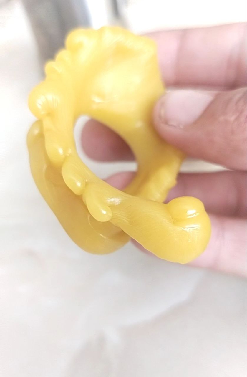 Прошу помощи в интерпретации отливок. Снимала рассорки с себя и МЧ. Первые три дня отливалось приблизительно одинаковой формы с волнообразным заборчиком посередине с кучей различных шишечек-наростов с динамикой уменьшения заборчика и шишечек. Там было более-менее понятно, что негатив рассорочный потихоньку уменьшается. А вот последнюю отливку не могу правильно прочесть.