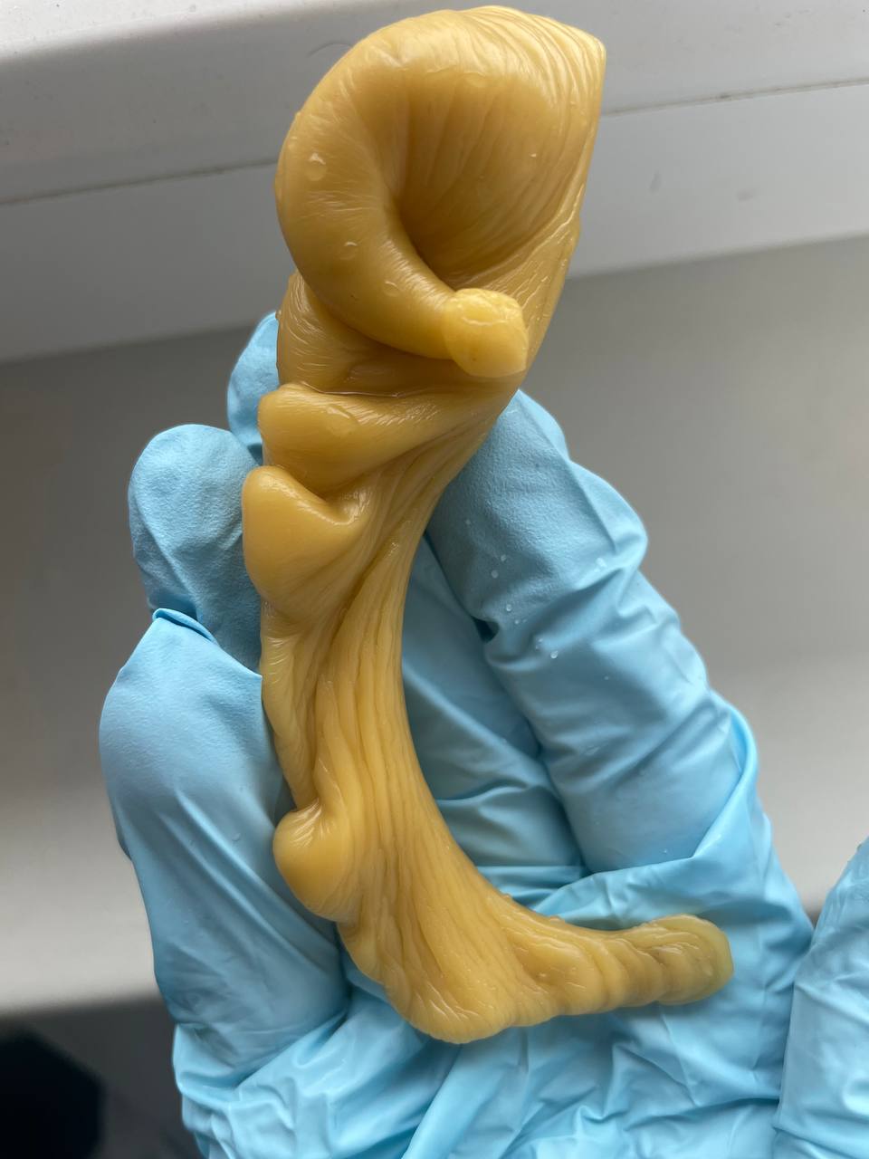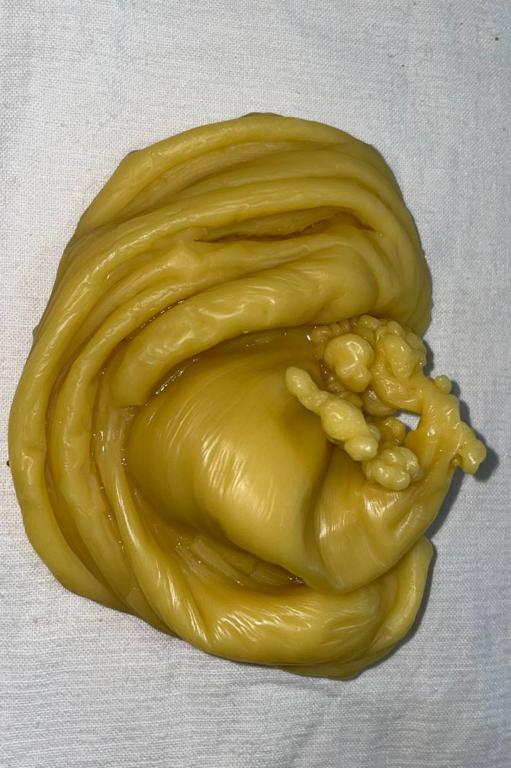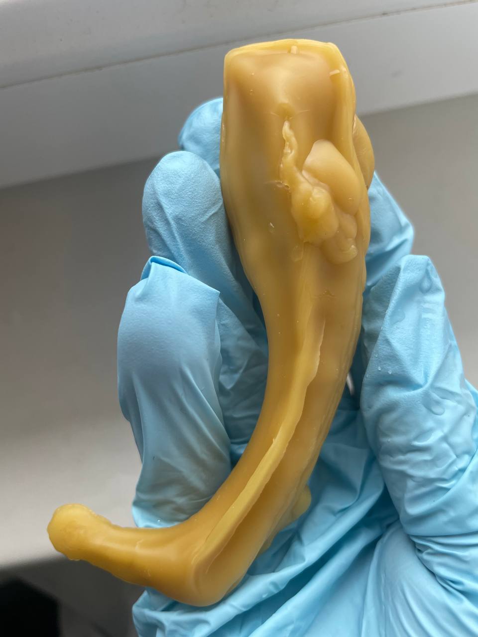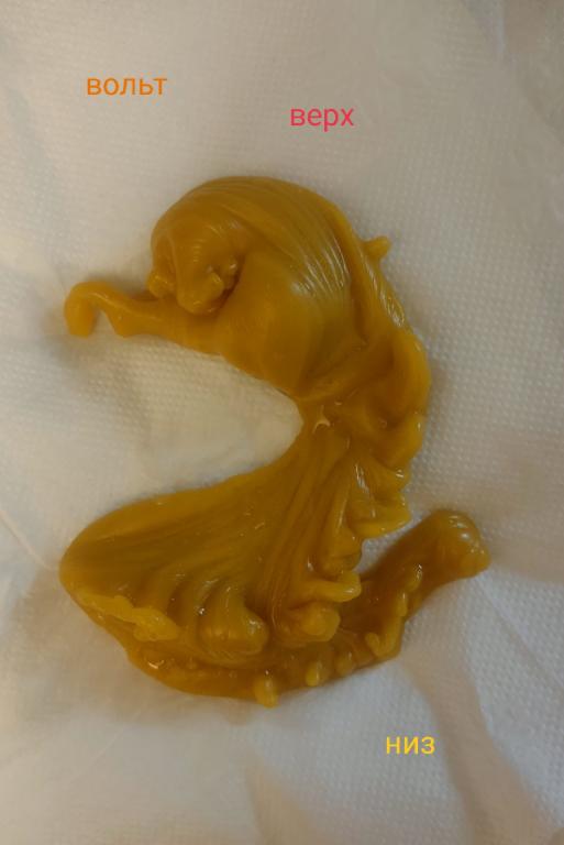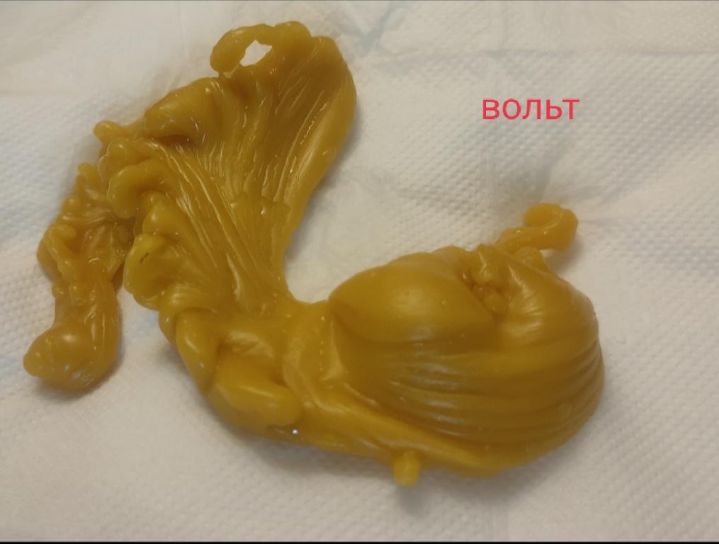 2. Потом мне захотелось прочитать заговор: "Воск выливаю, да его заклинаю, пусть выльется вольт..." И вышло на свет это чудо. Прям не иначе "Чудо-юдо-рыба-кит"!😂