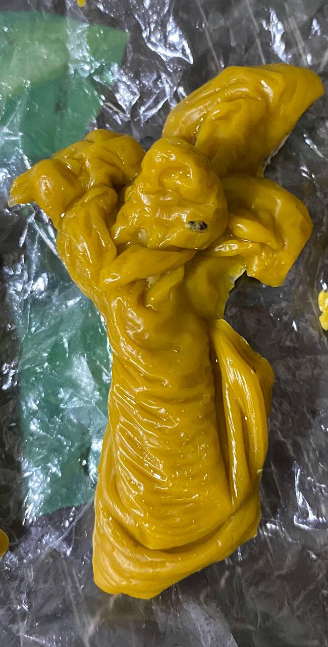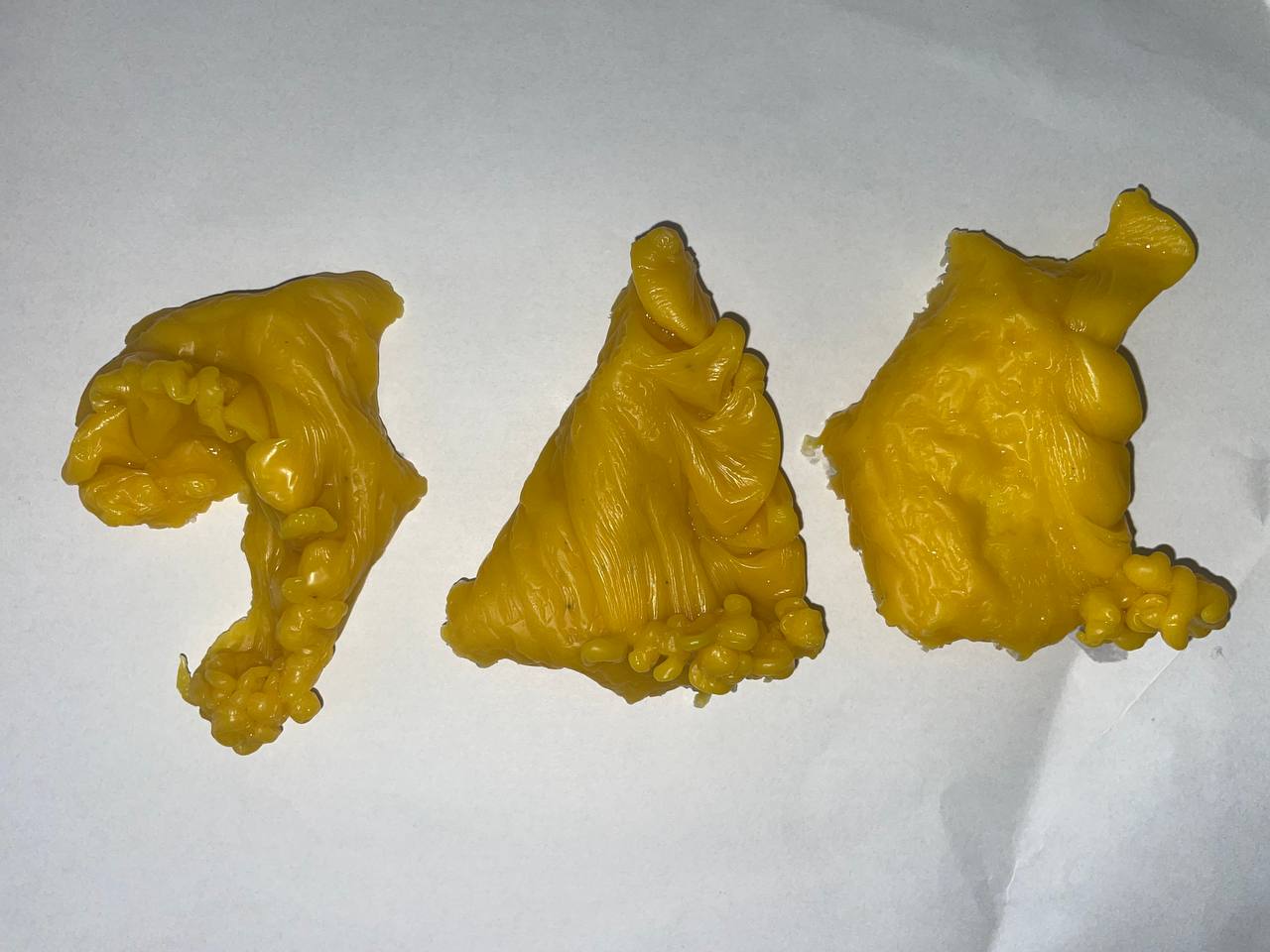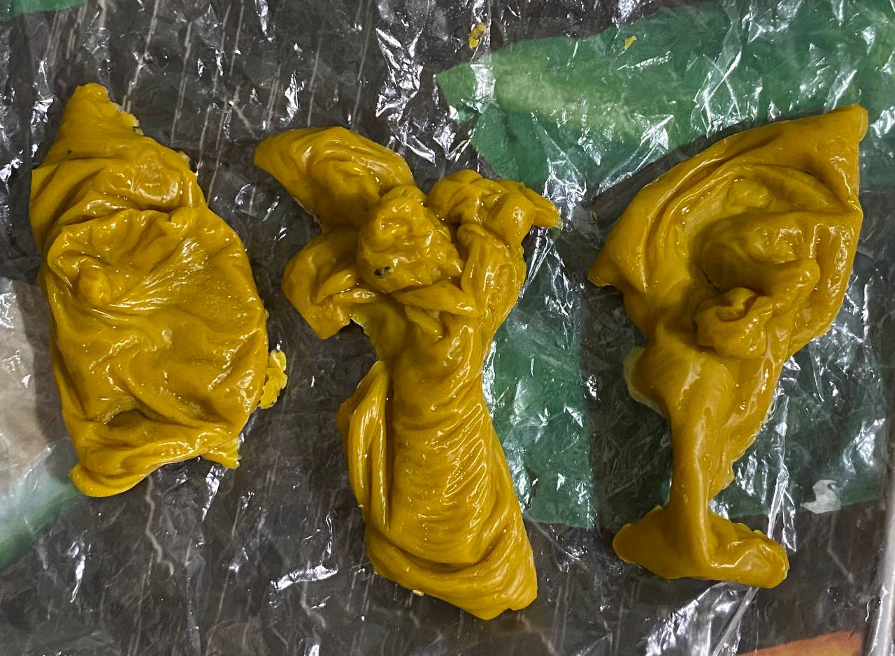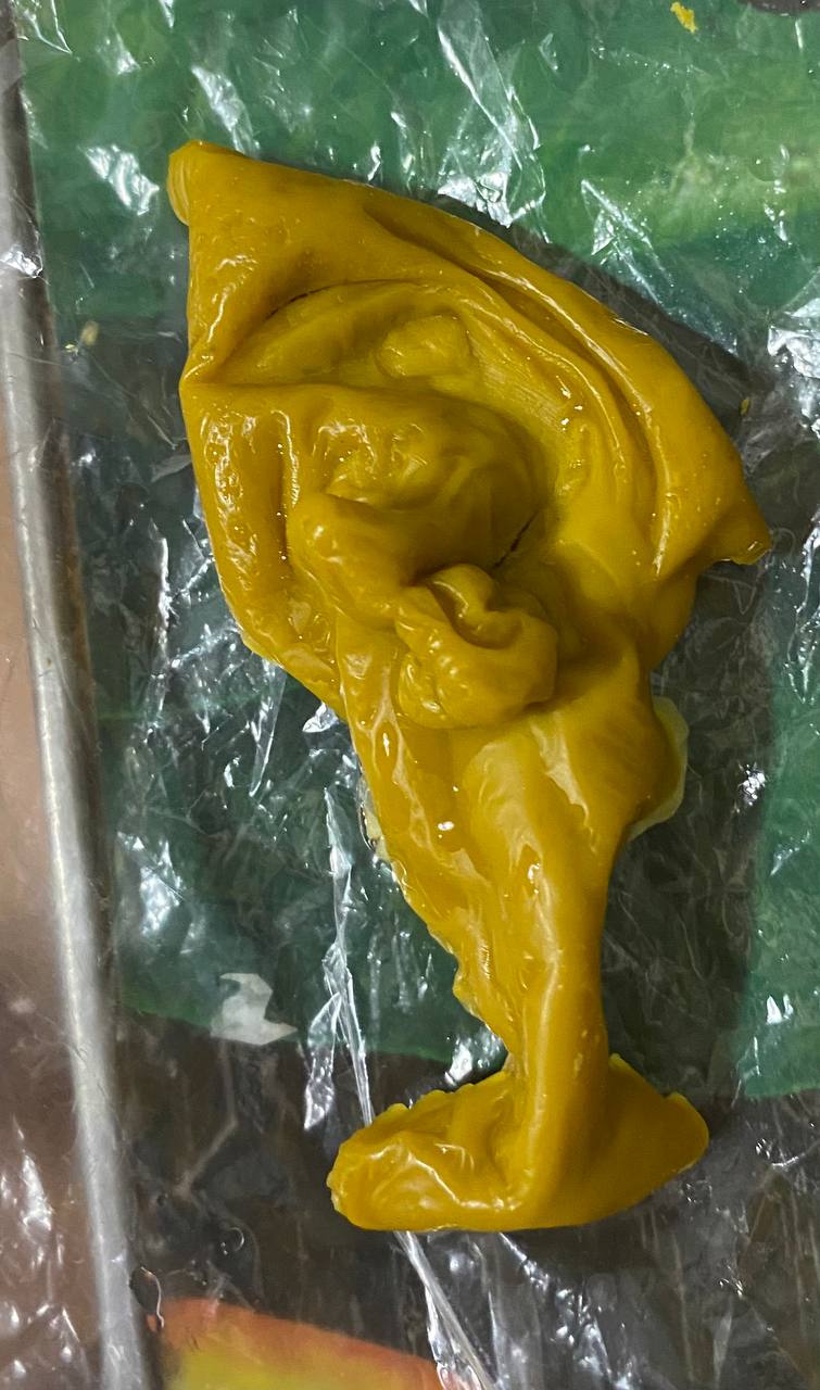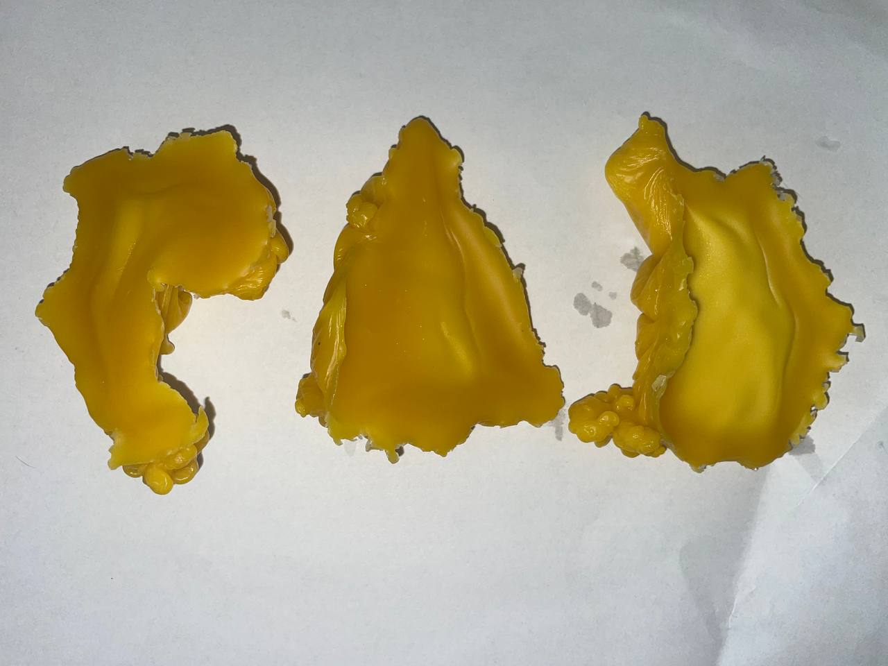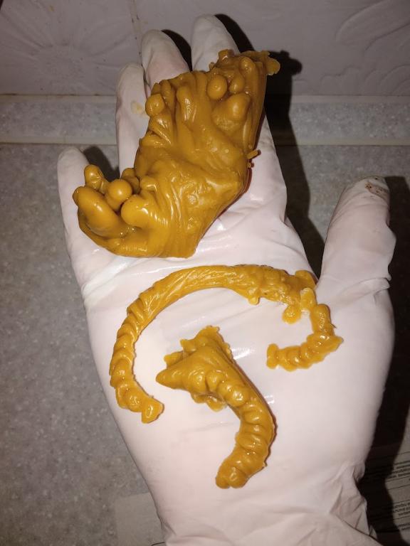 Верх- низ соблюдены. Отливала прям при ней. Отлила 3 диагностические. Правильно ли я понимаю (очень хочу научиться интерпретировать отливки), что есть бесовское влияние? На нижней чакре сущи? На последней отливке эта часть, как скомканная бумага - это порча? Также каналы? Еще 2 отливка с трещиной (пробои в ауре?, свежий негатив?).