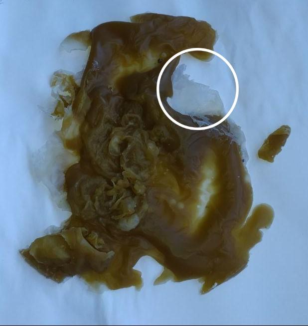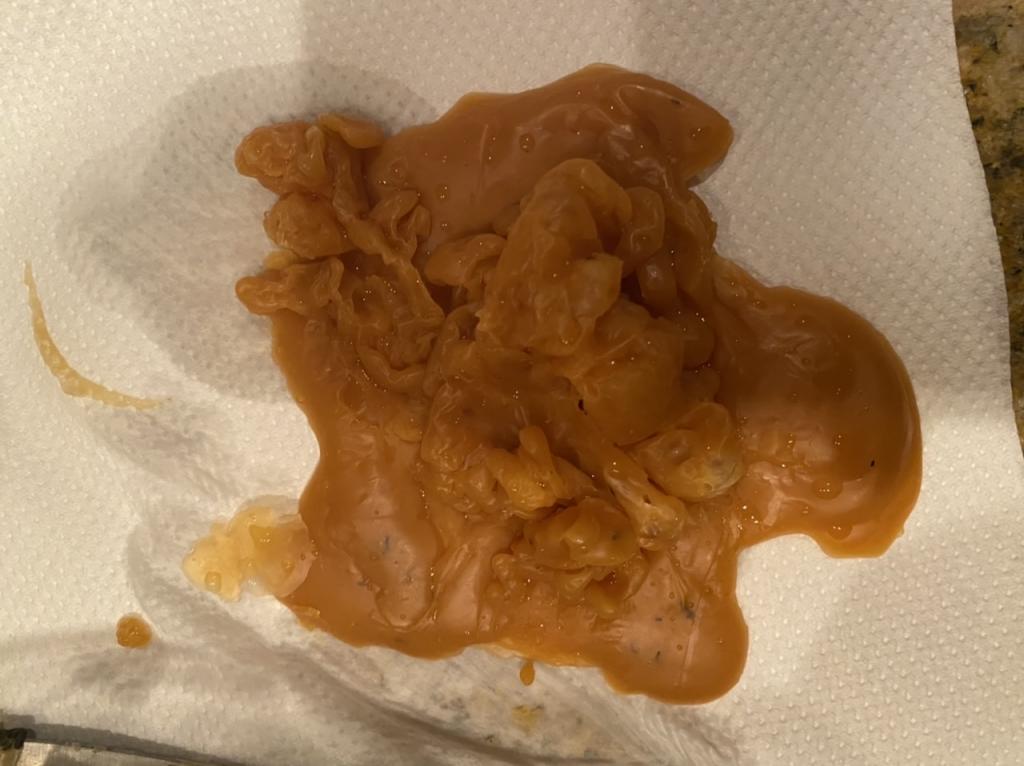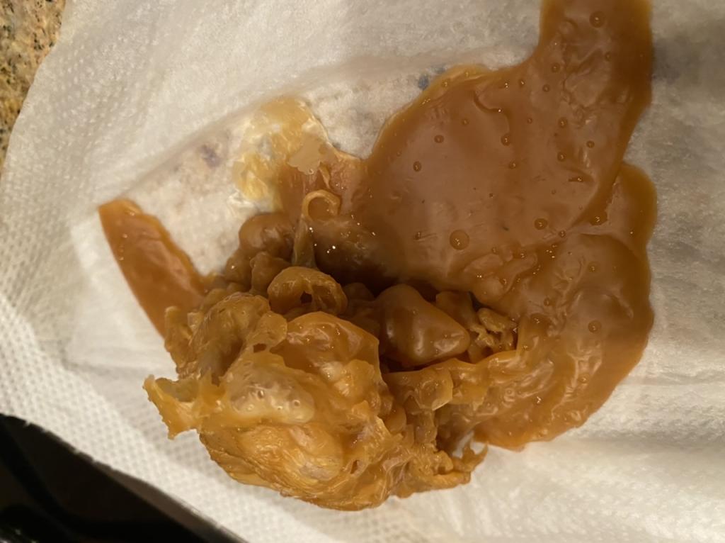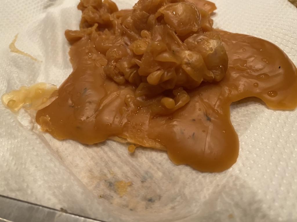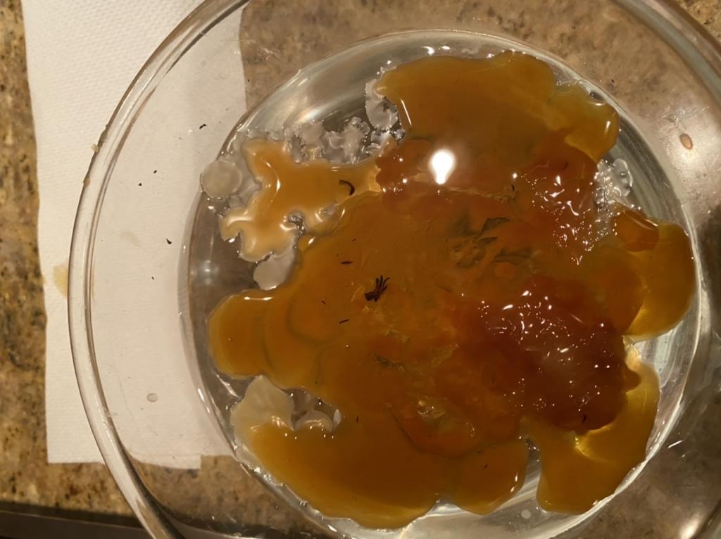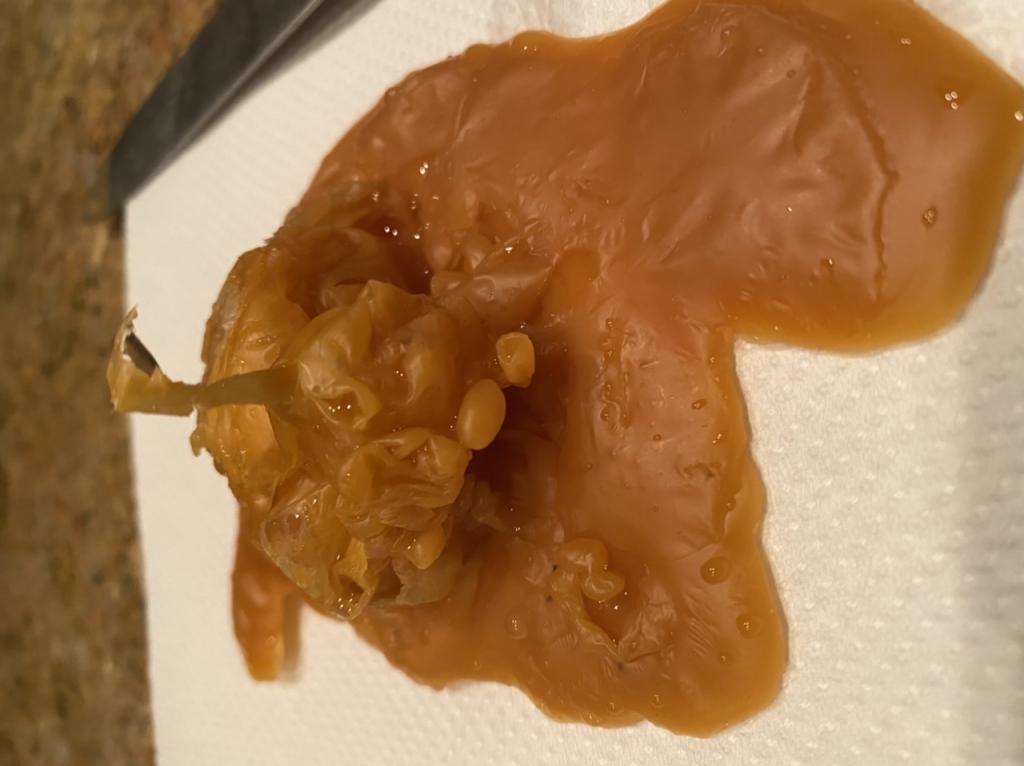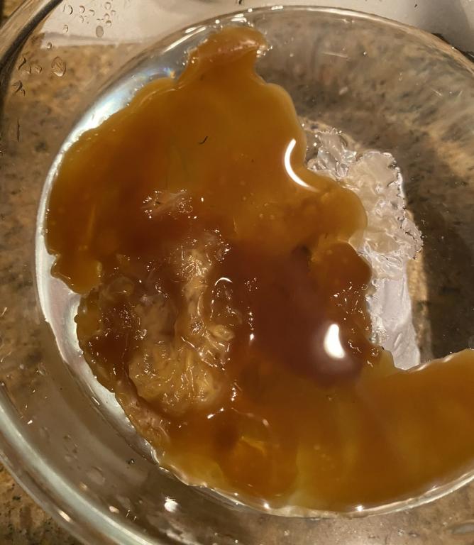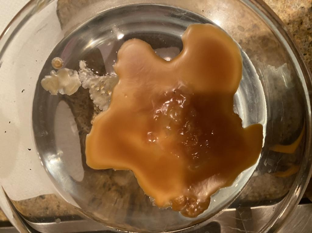 Ниже номер три. Она очень идентична тому что было ранее. И нет...её ничего пока что не берет, как я вижу. Это мерзкая тварь -морочище. Я вижу эту дрянь и представляю как она влияет на меня,  у неё даже что-то вроде губищ-рта. Отвратительнейшее зрелище, всё что я знаю - это то, что я хочу от этого паразита избавиться! Плёнка просто застелила всё...Она больше с каждой отливкой и мне не по себе. Почему-то даже рожи сущей не производят такое впечатление как вот это. Хотя, тоже своего рода сущь! И я ещё обратила внимание на интересный странный узор на этой плёнке! Не знаю на сколько видно на фото, но знаете что напомнило? Инфузорию-туфельку  — вид инфузорий, одноклеточных организмов.  (Встречаются в пресных водах. Средой обитания инфузории-туфельки являются любые пресные водоемы со стоячей водой и наличием в воде разлагающихся органических веществ (разлагающихся...Как раз на моей предыдущей (первой) морочной отливке видно некое как-бы разложение...)) Суть в том, что и я и не только я видим, что в наведении на меня воздействий, помимо прочего, участвовала вода неким образом. Сижу я в 6 утра и думаю, про Инфузорию туфельку...А нет ли тут связи?Вода во снах постоянно. Может и было произведено сокрытие через воду как раз. Но эта дрянь пока не особо сдается :( Или я чего-то не вижу...( ну да, я ж под мороком... >:( )
