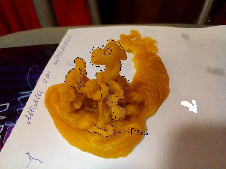 На первой отливке, справа, отчётливо вижу вытянутую морду, она будто "смотрит" из сморщенного кокона. Предполагаю, есть негатив, на котором  стоит замок (кокон).