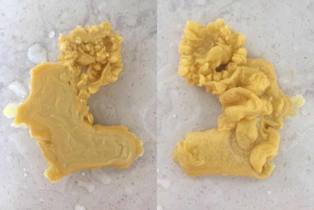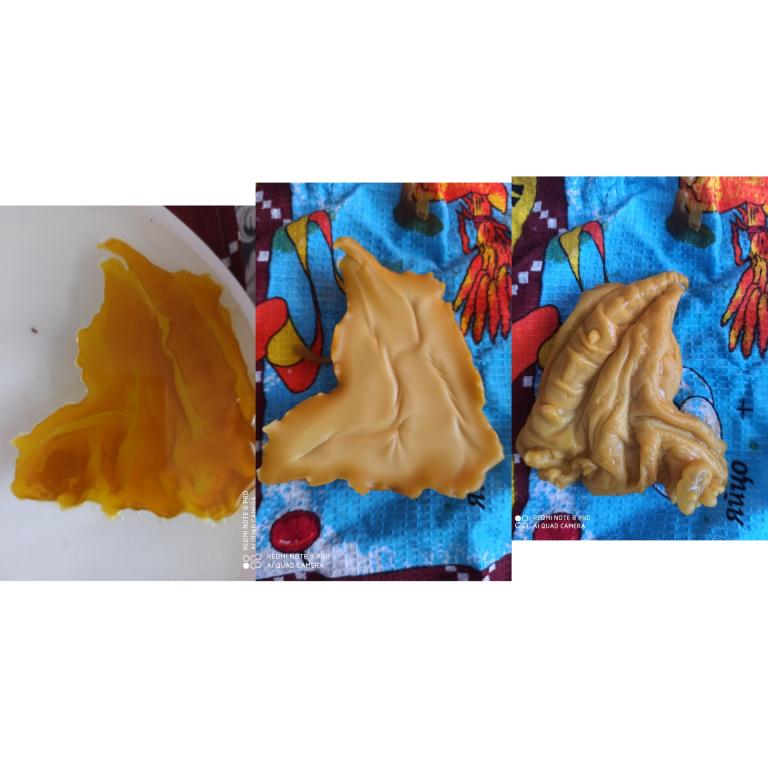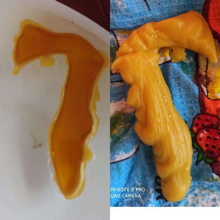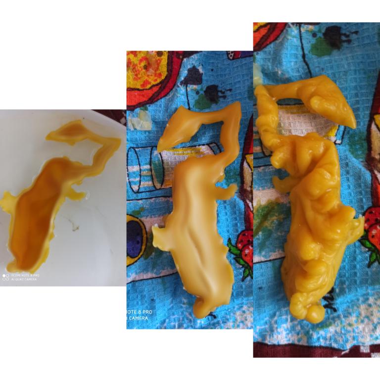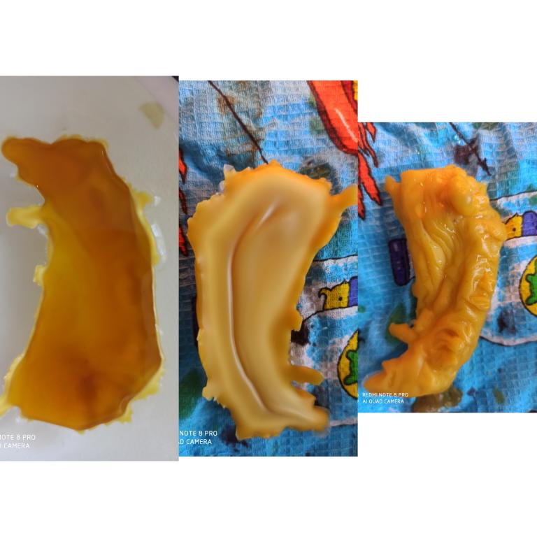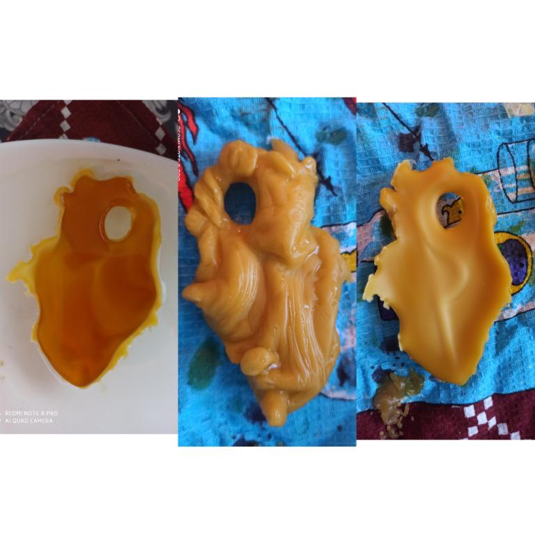 Доброго времени, Лолита Иванова. Позвольте дополнить всех Вам помогающим в трактовке. Я от себя хочу сказать, что воск пока еще не особо цепко снимает негатив. Довольно плавные и сглаженные формы. Однако есть потаенный негатив, который приоткрылся. А на последней отливке так и вовсе прорвались, можно сказать, пузыри с проклятиями и ушло все в воду.