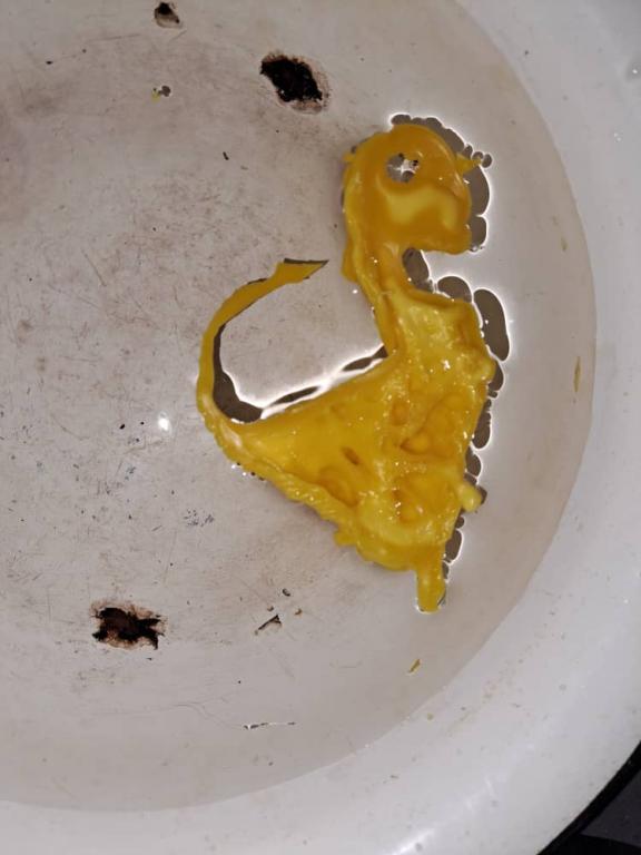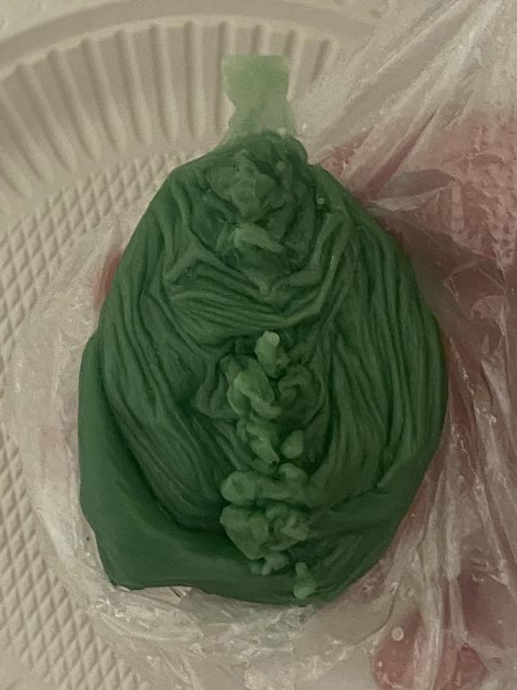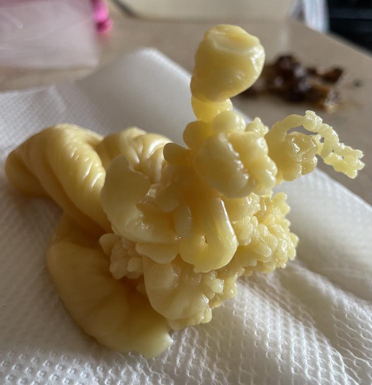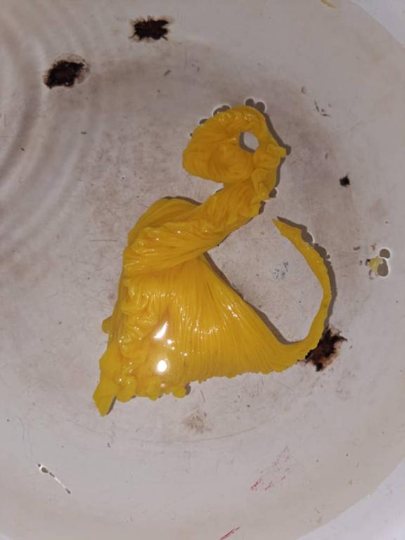 Решила сделать диагностику с заговором, получилась очень странная отливка, особенно ее внешняя часть. Раньше все отливки снаружи были идеально ровные, воск брала разный, от свечей. В этот раз взяла кусковой натуральный пчелиный воск и получилось вот, что: