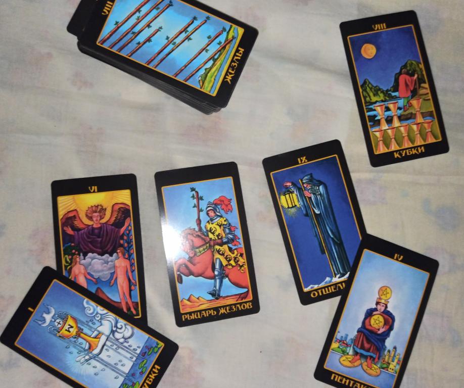 Рыцарь кубков - влюбленные - 2 мечи - колесо фортуны - суд - верховная жрица ( достала доп 5 мечи)