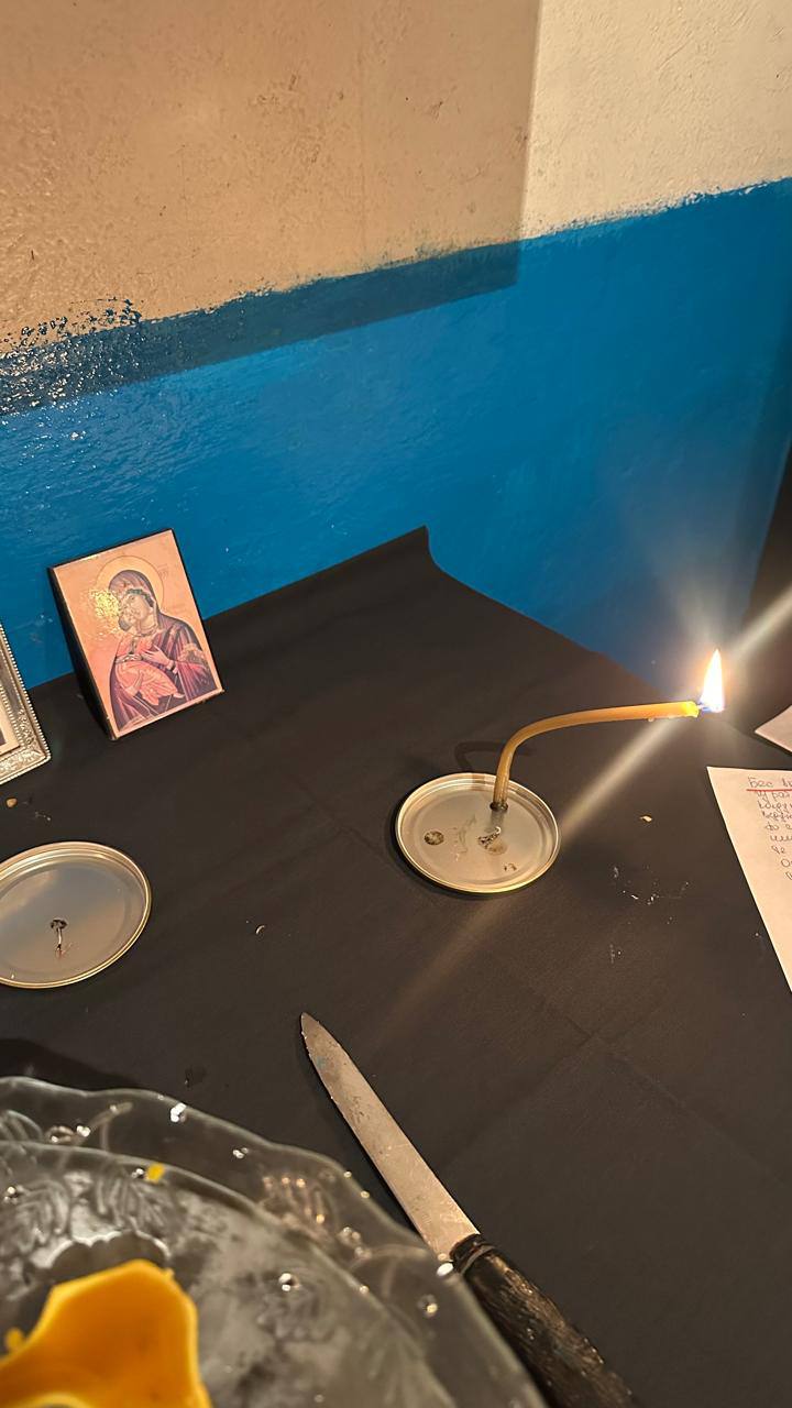 Свечи церковные , начали гнуться от икон. Горлом три штуки. Смогла заснять только одну. Потом не до сьемок стало.
