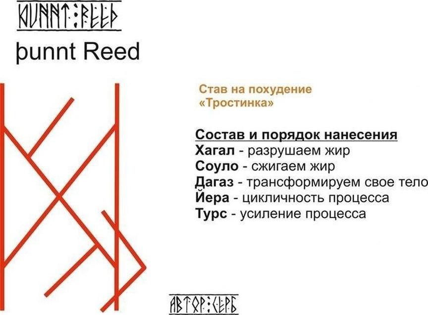 "Пусть данная руническая формула, сделает так, чтобы я (ФИО) похудел(а) на «столько-то килограммов». Пусть ДРФ выполнит мною оговоренное, используя только мою личную силу. Пусть ДРФ начнет свое действие сейчас. Пусть ДРФ прекратит свое действие сразу как только выполнит мною оговоренное. ДРС работает без вреда для психического, физического и энергетического здоровья ФИО. ДРС я активирую прямо сейчас своим дыханием, да будет так. Так и есть!"