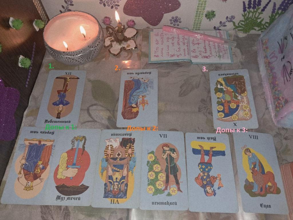 Добрый день! Расклад от женщины на чувства женщины (любовные). Впервые в жизни я влюбилась в человека своего пола, я не против, но странно то, что мы враждуем обычно с ней, хотя я и восхищена ей. Видимся часто. Она замужем (я рада, что о ней есть кому позаботится, на ее брак не претендую, просто хотела бы стать любовницами), она колдунья, религиозна (пока я не поняла, насколько сильно), значительно старше меня, она жесткая, я мягкая. В ней есть все, что мне обычно нравится в мужчинах, только она еще и красивее моих бывших) Единственные минусы для меня в ней - то, что она колдунья и религиозна. Колода классическое Таро Райдера-Уайта, в прямом и перевернутом положении. Плюс за любой ответ