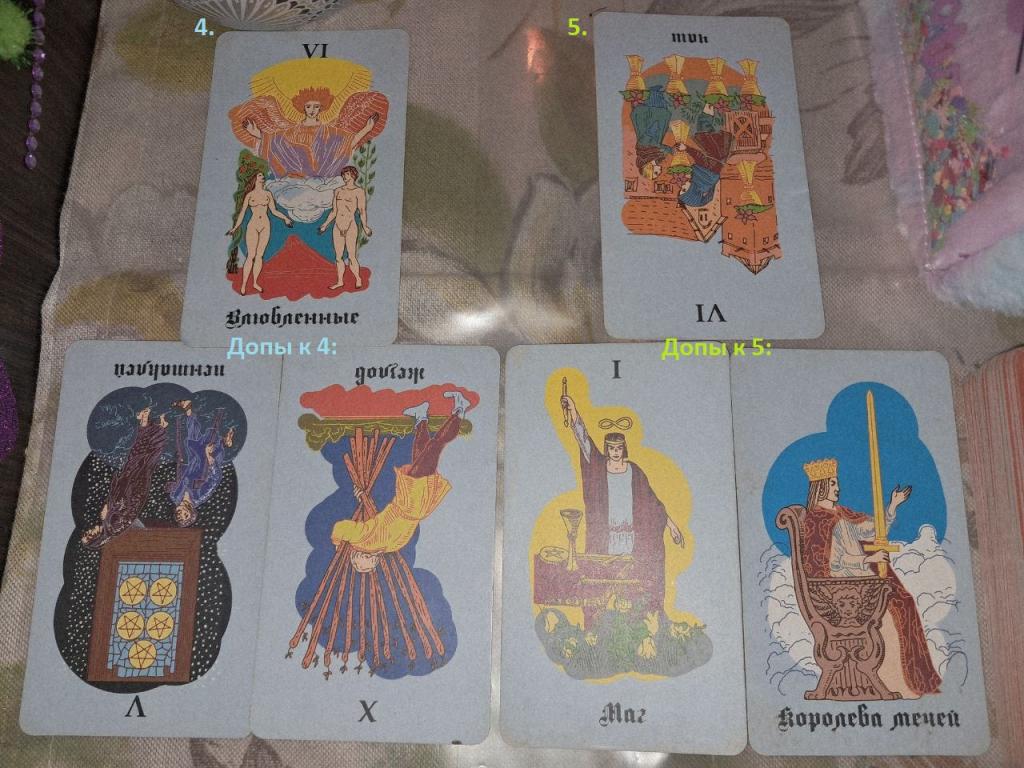 6 Влюбленные прямой. Допы: 5 Пентаклей перевернута и 10 Жезлов перевернута.
