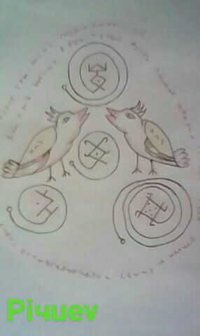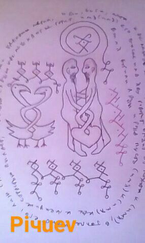 Запрещенный талисман славянский "На супружескую верность!" Нарисовать птиц и руны Лады! На птицах написать имена супругов! После по часовой стрелке пишем свой текст, например: "Во имя Лады и рода пусть (имя) со мной(имя) жеребец, а с другими мерин! Во имя Лады и во имя рода! Гой! Одымить розой! В центр можно положить привязки! Свернуть и спрятать дома.