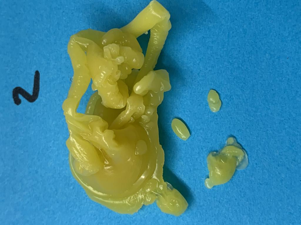 2. Здесь замка уже нет, но вылезло больше негатива, чем в первой отливке, и тут как будто по линии матери его очень много. Я правильно понимаю, это потому, что сняла замок и весь негатив полез? Еще наверху вижу каналы полезли.