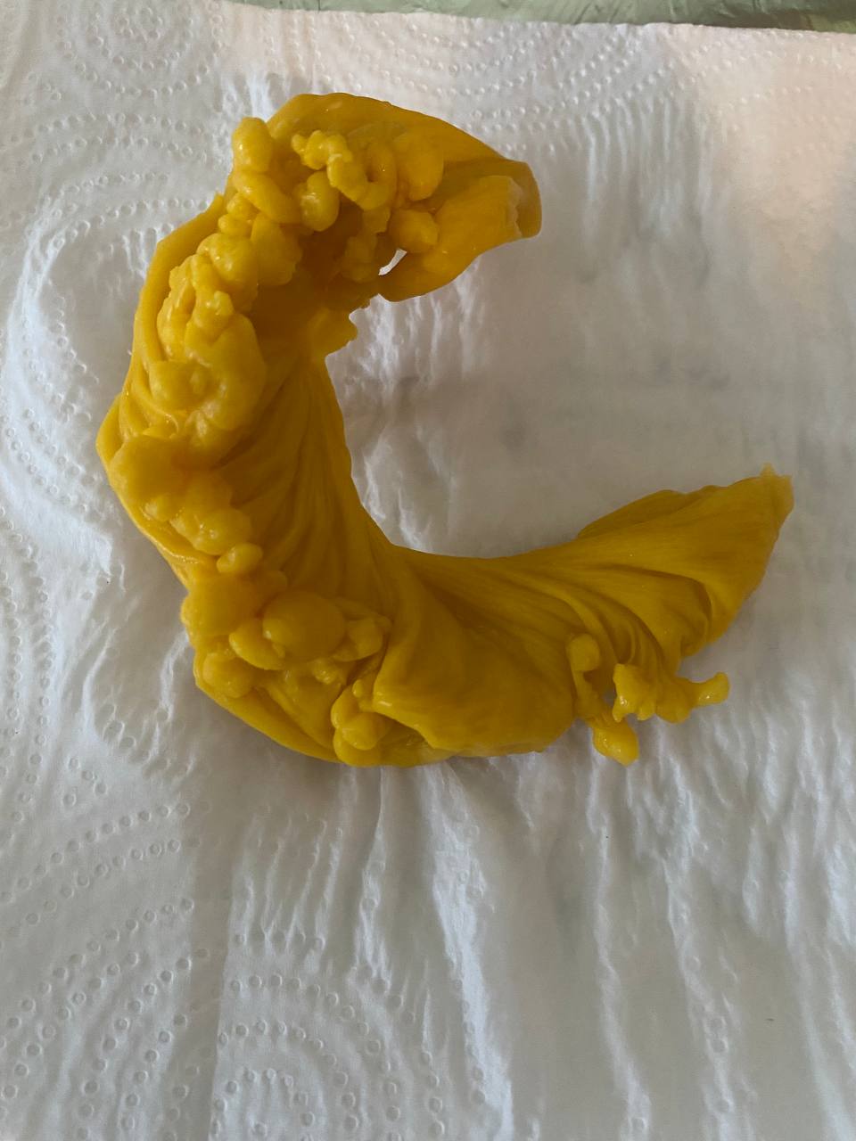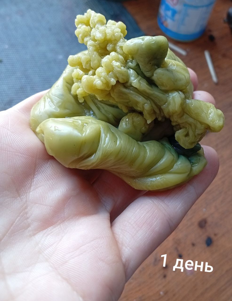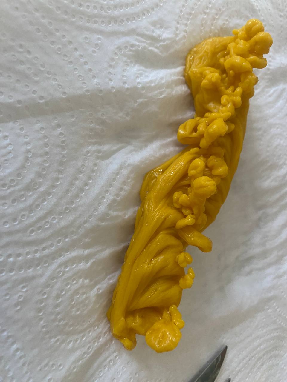 На третьей уже "хобот" присоеденился к телу, но борозда ещё есть и глубокая, а на середине вылился вот такой столбик, ну и на "голове" куча из узлов и шишек, такое чувство что перешло всё в голову.