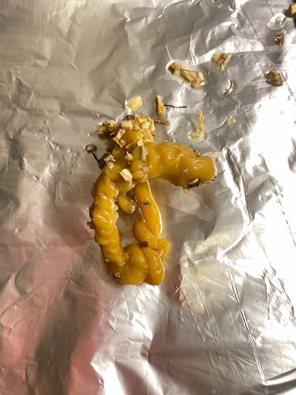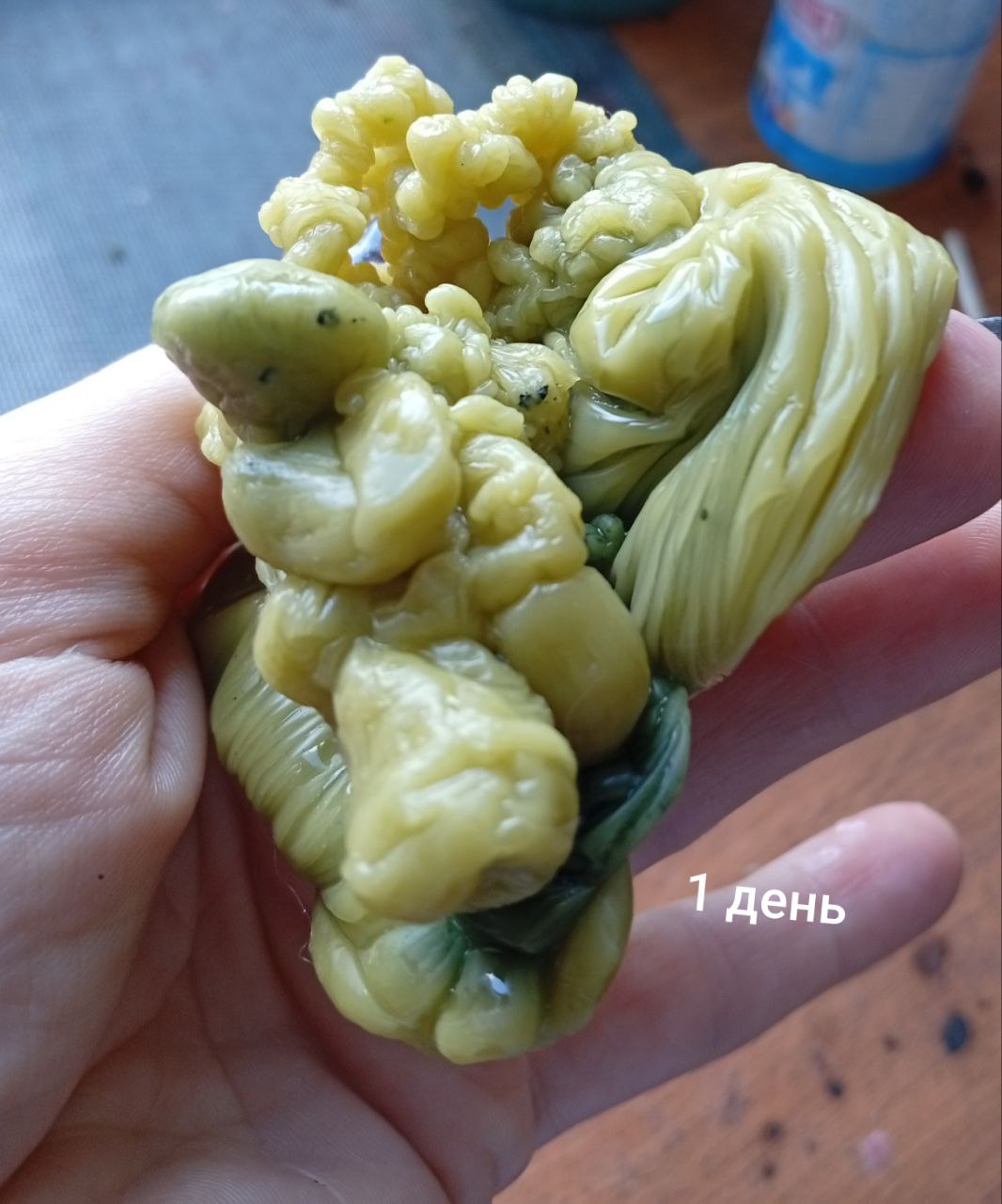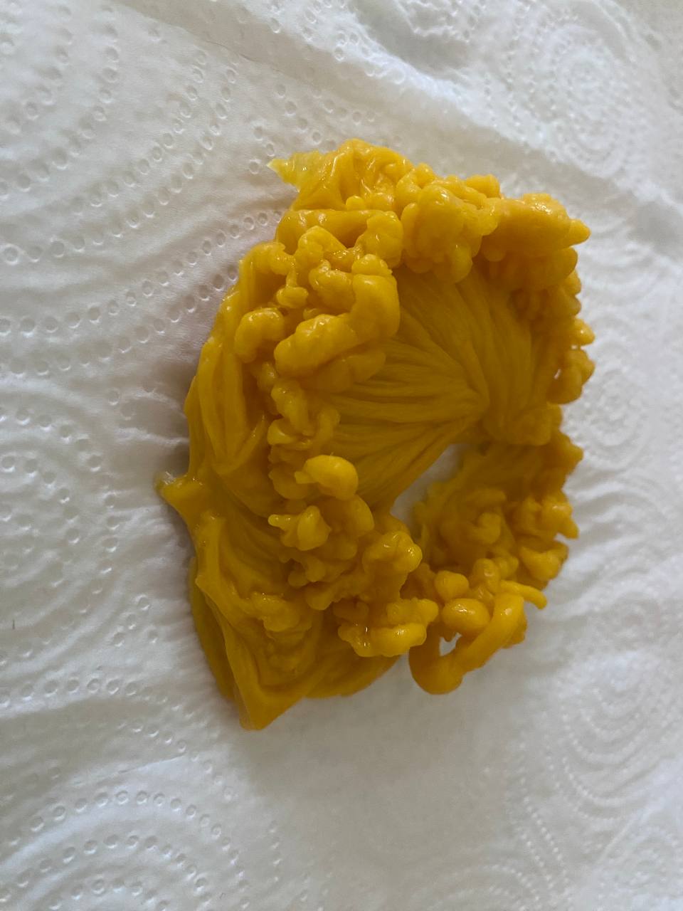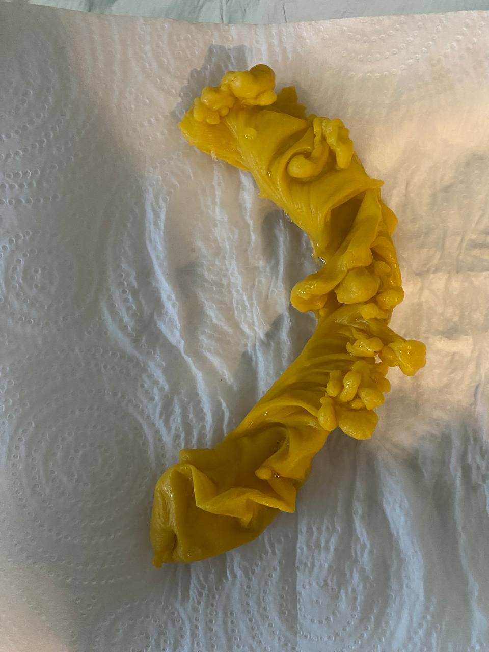 На третьей уже "хобот" присоеденился к телу, но борозда ещё есть и глубокая, а на середине вылился вот такой столбик, ну и на "голове" куча из узлов и шишек, такое чувство что перешло всё в голову.