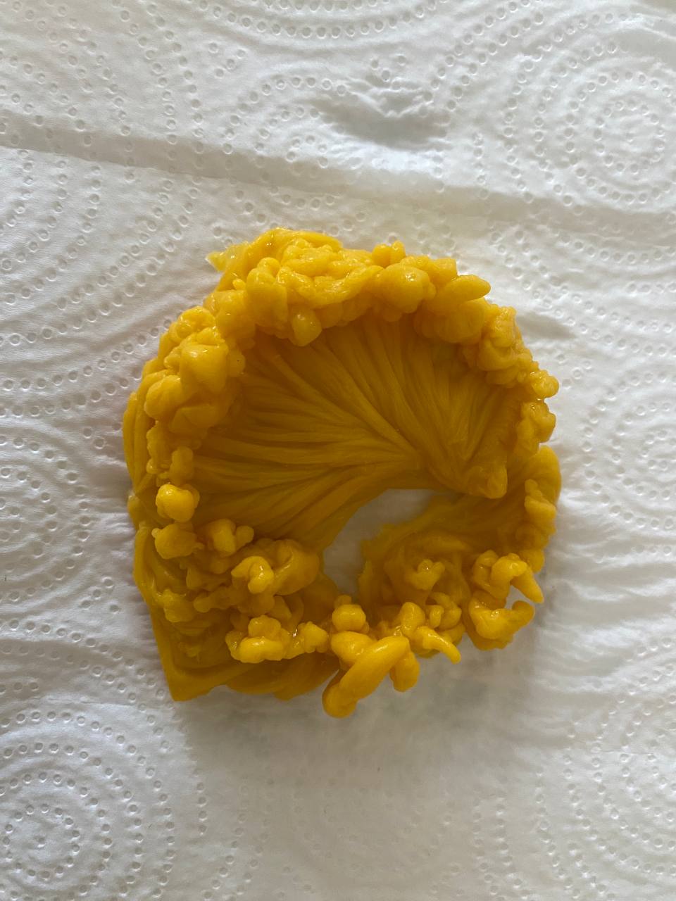 На второй уже этот "хобот" встал четко перпендикулярно и средние с основным "телом" утончилось, предполагаю , что отрыв наметился, но за то появилась дыра посередине с кольцом , как будто сушь?(Неуверенна) переехала в середину и прогрызает там??
