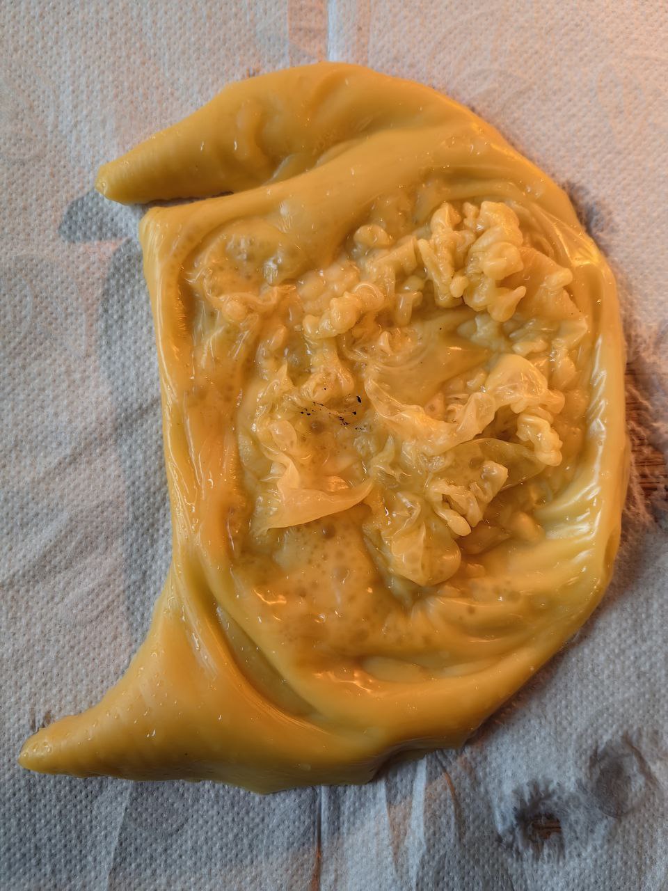 Добрый день, уважаемые знатоки. Делала отливку на отношения. Не могу понять, что за дуга? На закольцовку вроде не похоже, или похоже? 🤔  может что-то еще увидите, помимо обид и ссор? Это 5 отливка , она треснула в воде, пока застывала. Что это значит?