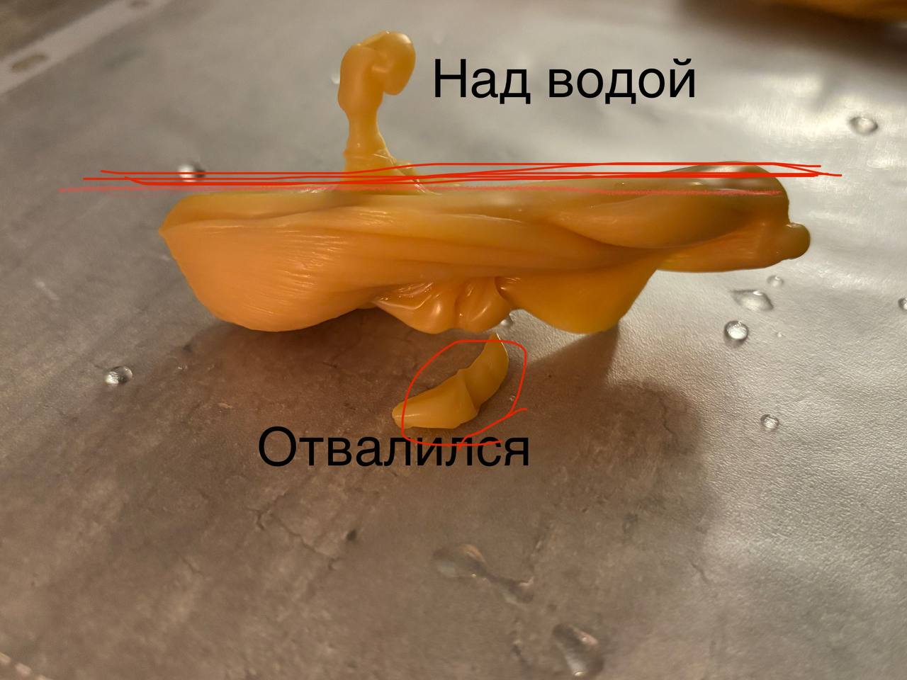 Обычно перед тем, как достать притапливаю отливку в воду. Понимаю, что в этой временем промахнулась и она не успела до конца застыть, вот и полезло вверх. Но что это могло полезть, какой вид негатива?
