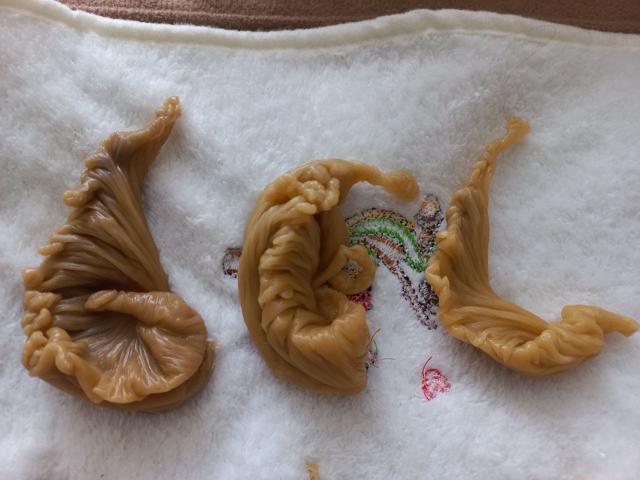 Опишите как льете, вода комнатной температуры? (Нужно чтобы из холодильника только достали), как часто меняете и какой ковшик у вас, с носиком, эмалированный? Воск правильно выливаете, когда он начинает оставлять тоненькую пленку на стенках ковшика?