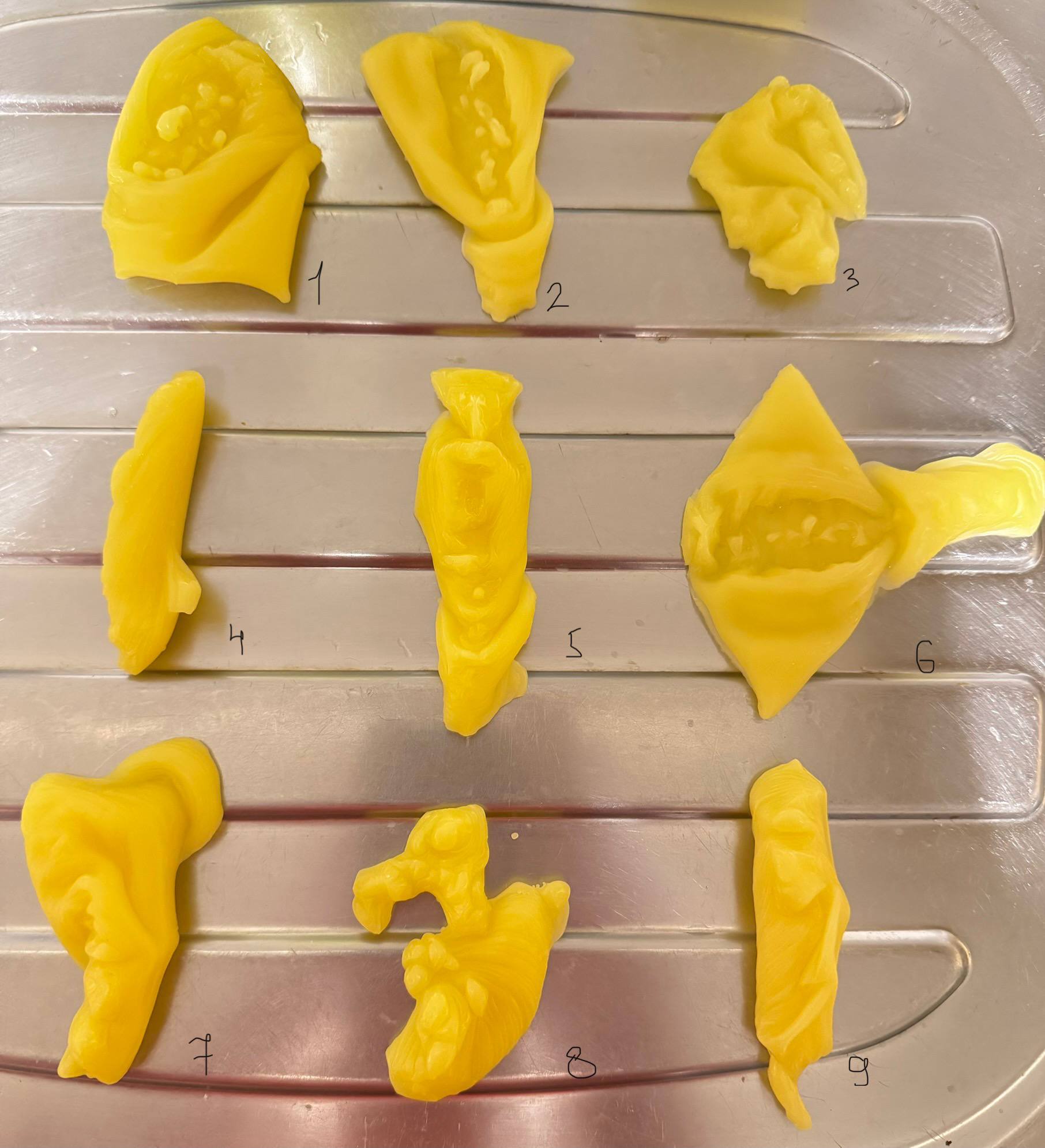 По этой серии отливок можно сказать что природа подселенца из области бесов. Можно говорить и за родового, но это без особой важности. Факт в том, что Вьетнам гладит эту сущь как котика за ушком. Воск таки что-то срывает, возможно самозащиту какую от самого беса и уже видны намеки на наличие беса. Интересны конечно отливки 1, 2, 6. Но вот остальные отливки уже показывают полузакрытого подселенца. И вот гребни на отливках говорят за подселенного беса. Вывод сам собой напрашивается. Серп, призыв высших и воск.