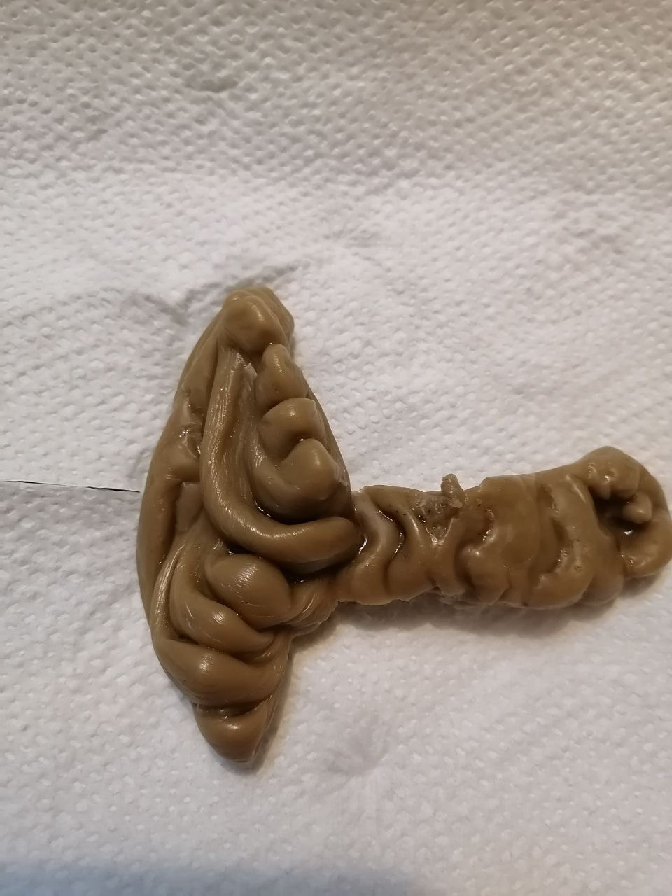 Здравствуйте, уважаемые знатоки! Сколько выливаю но вот такой "молот тора" впервые вылился. Помогите с интерпретацией. 🙏 верхние два фото это как оно было в миске с водой с одной и со второй стороны