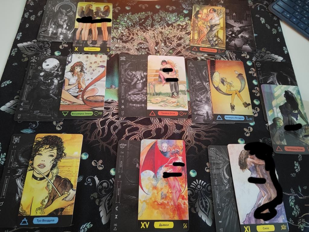 Первый ряд - чувства, по Гоэтам, есть некая обида и переживания связанные с вами, но и усталость наблюдается, по Манаре вы оба перетягиваете одеяло на себя, он же от вас начинает испытывать эмоциональную зависимость.