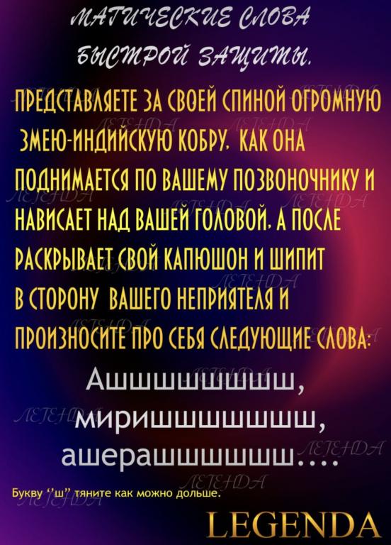 ✨ Представляете за своей спиной огромную змею-индийскую кобру, как она поднимается по вашему позвоночнику и нависает над вашей головой, а после раскрывает свой капюшон и шипит в сторону вашего неприятеля и произносите про себя следующие слова: