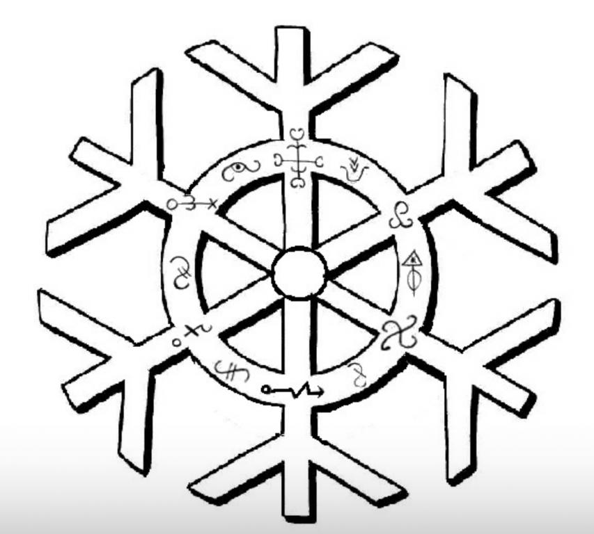 За основу выбрала так называемый шестилучевой «Крест Силы» или Кельтский крест, переходящий в Альгизы в круге - символы, характеризующие основные сферы жизнедеятельности, которые снежинка берет под свою защиту: здоровье, благосостояние, любовь, красота/ привлекательность (сексуальная в том числе), гармония и связь с людьми, удача, сила и способности (не только магические),есть символы для трансформации, для перемен к лучшему, для новых начинаний и открытий, а также для жесткого противостояния врагам и их наказания.