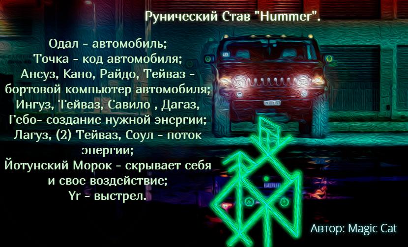 Рунический Став "Hummer", скорее не совсем став или какая - то подселенная сущность с привязкой к рунам, а напротив - он и является действительно техническим творением в виде настоящего автомобиля на тонком плане, который защищает, чистит своего владельца и прорабатывает родовые структуры... Такая машина создавалась строго по схеме Всевышнего - Творца и была активирована через подключения к Солнечной Системе, где и подпитывается, подбирает определенные энергии для своей работы.  "Hummer" - это не сущность, не став, не фетч, а реально техническое устройство, которое работает как "ИИ" - Искусственный Интеллект. Данный автомобиль -  сам определяет искажение в судьбе человека, линиям жизни, вероятности как с прошлого, настоящего так и будущего, а так же затирает негативные события, деструктив направленный на вас, ваших родственников, который повлек за собой последствия и может отыграться в будущем. Можете распечатывать как на листе бумаги, так и на своей фотографии - это не важно. Обводить и оговарить каждую руну не нужно, так как есть определенная работа программы автомобиля "Hummer". Просто рисуем или распечатываем, просим защищать, вычищать от отрицательных воздействий, гармонизировать,  найти причину данной проблемы и устранить её. Так же машину можно просить помогать направлять на путь истинный, так как она даёт подсказки. "Hummer" - не является руническим писанием, Руны - это ключ к уже созданному продукту.