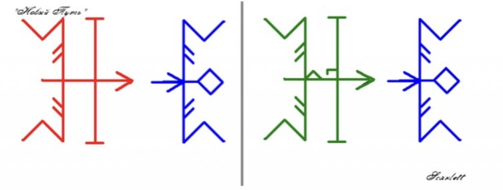 Слева - старая судьба (Перт зеркальная) со всем нематериальным багажом (Ансуз зерк.) и материальным (Феху зерк.), которые мешают, из-за которых все как-то не так, все плохо. Справа - новая счастливая судьба (Перт) с тем же багажом, но уже правильным, помогающим. Соединено все это руной из ряда Соль-рунир (S - руна для получения желаемого), но в линиях этой руны зашифрованы также стилизованные Наутизы в виде прямых крестов по линиям обоих Перт и посередине две руны Хагалаз, тоже стилизованных, поперечинки прямые (составлялось на интуитивном уровне, потому вот такое, стилизованное). Ромб справа означает также Ингуз как завершение "перевода" и символ благополучия в новой судьбе. На горизонтали встроены в первой версии - глиф "победа" (стрелочка как Тейваз), во второй версии - дополнено глифом "усиление".