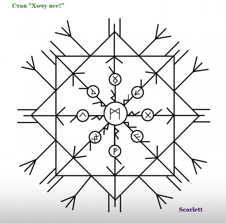 Итак, став состоит из октограммы - двух квадратов, означающих земные и духовные потребности человека, их соединение. Стороны 4-угольников являются также стенками рун Перт, по углам (внешняя сторона) - Альгиз и Эваз, внутри из углов идут руны Эйваз и Лагуз к кругам, в которые вписаны руны, обозначающие сферы жизни (или просто желания). На руне Эйваз вписана руна Кеназ. В центре руна Соль, внутри Манназ - объект воздействия (человек, для которого делается став. Можно также обозначить Тейваз/Беркана/Лагуз при желании). Круг с Манназ соединяется с кругами сфер жизни/желаний рунами Райдо.