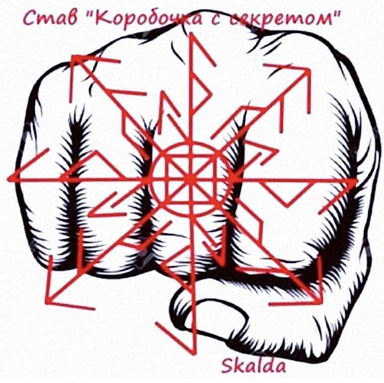 « Данный рунический став, силой этих Рун и при поддержке Северных Богов, блокирует насланный негатив и скрывает < имя>, ликвидирует и отсекает все вредоносные программы, вампирские присоски и каналы, порчи, сглазы, наговоры — вольные и невольные.