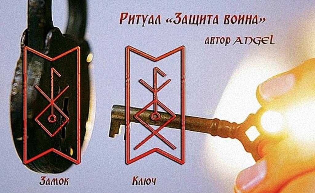 Силой рун, что вплетены в данные рунические ставы – замок и ключ – закрывают и защищают меня (либо...имя ) от стали железной, от дротика каленого и некаленого, от пуль летающих, от сабель острых, от меча булатна, от ножа, топора и пушечного боя, от свинцовых пулек и от метких оружий, от стрел и любого вида оружия. Уберегают меня (либо....имя) от ранений, контузий, инвалидности, смерти, врагов, предателей, участия в боевых действиях. Замком замыкаюсь, ключом запираюсь, кидаю я замок в воду дождевую, кидаю я ключ в воду дождевую. Как этот замок никогда этим ключом не открыть, так и меня ничем не взять, не сгубить, работу эту не снять не убрать. Работу свою защищаю от чужих глаз скрываю.